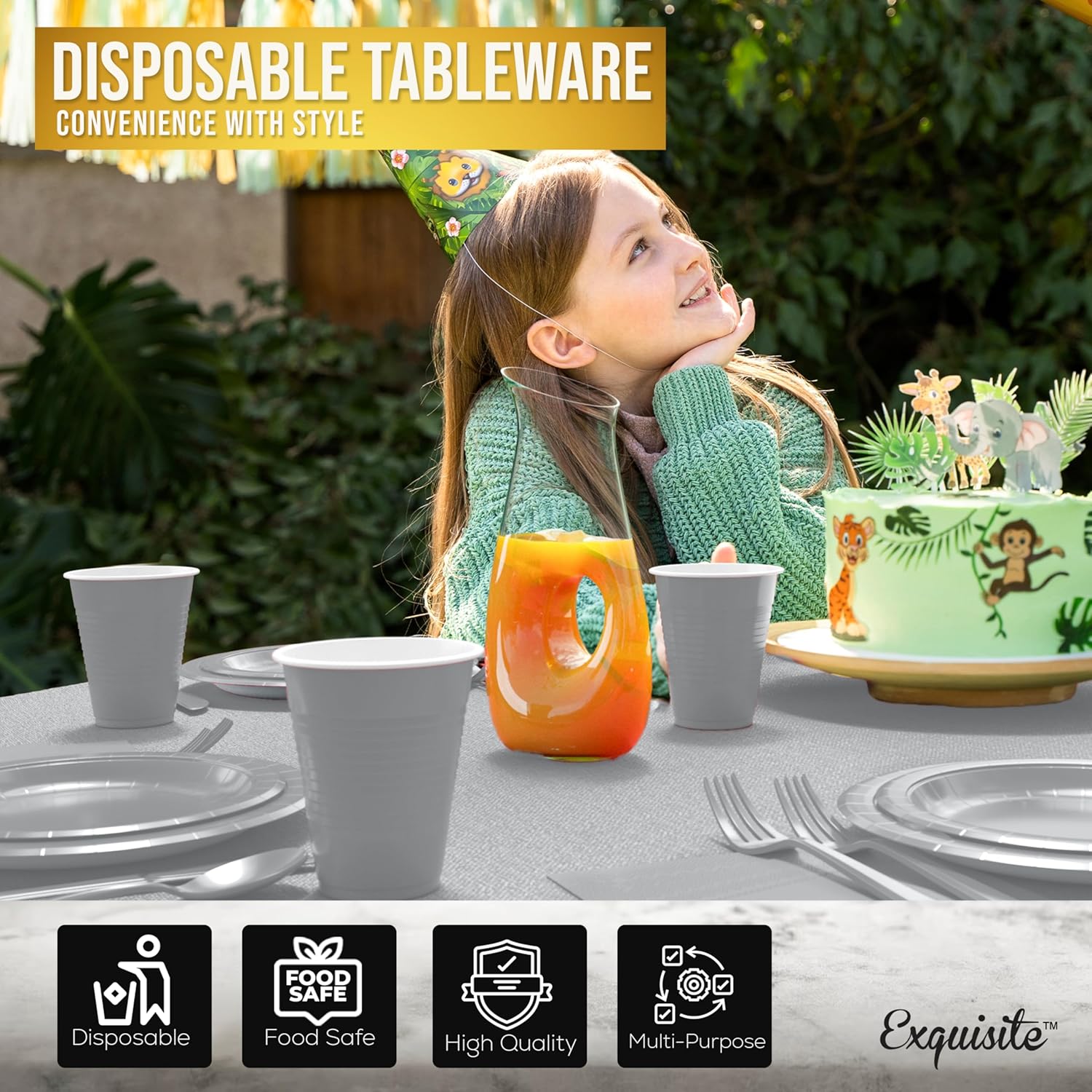 222 Pcs Silver Paper Plates and Napkins Sets, Disposable Plates For Party, Lunch & Cocktail Napkins Paper, 18oz Plastic Cups, Cutlery and Silver Table cloth Plastic Dinnerware Set