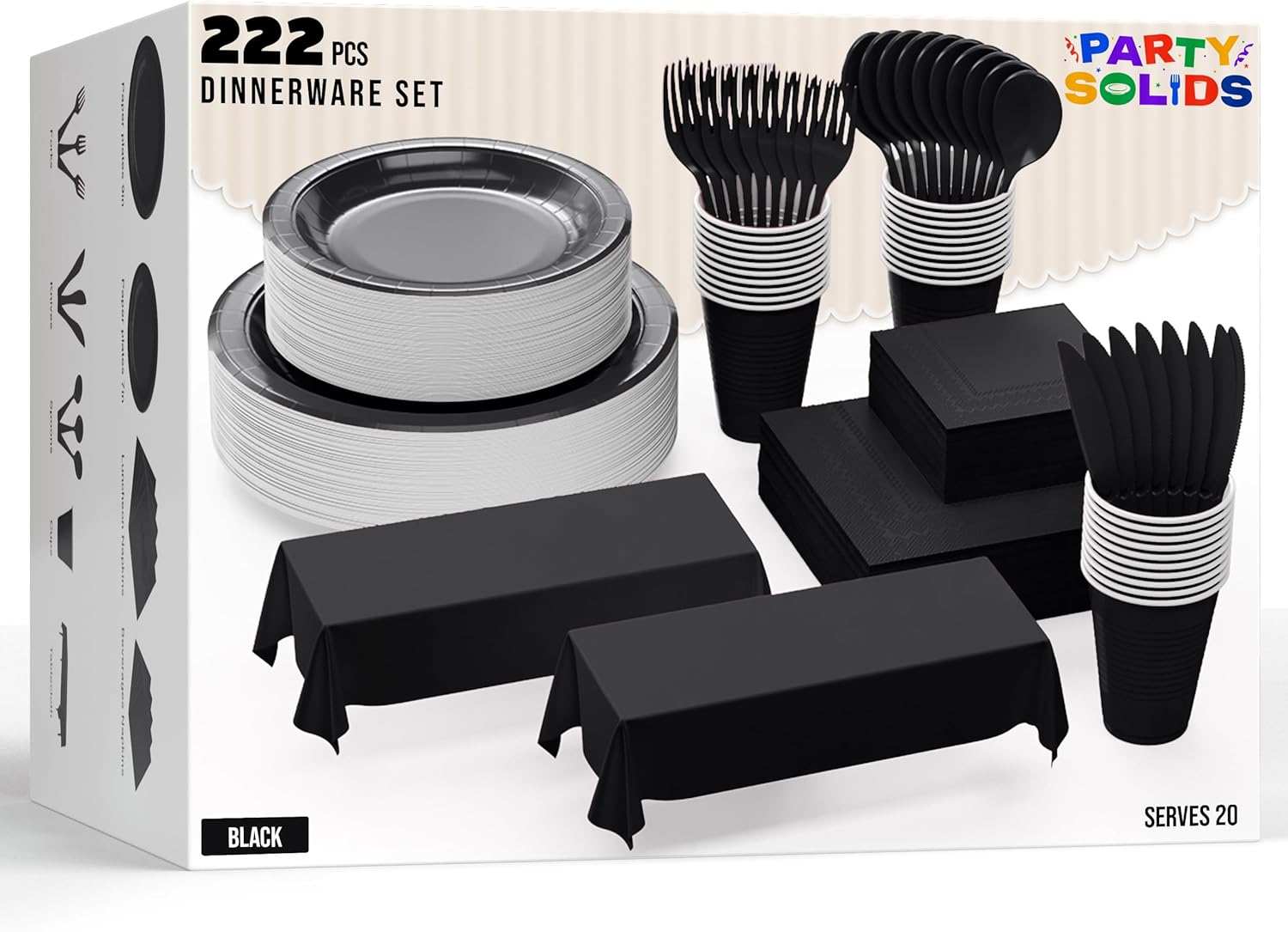 • Easy Cleanup: No dishes to wash! This disposable plates and cups set saves time and stress. With disposable cutlery, black paper plates, and plastic cups, cleanup is quick. Ideal for hosts who want a convenient, no-mess solution with stylish black party supplies.