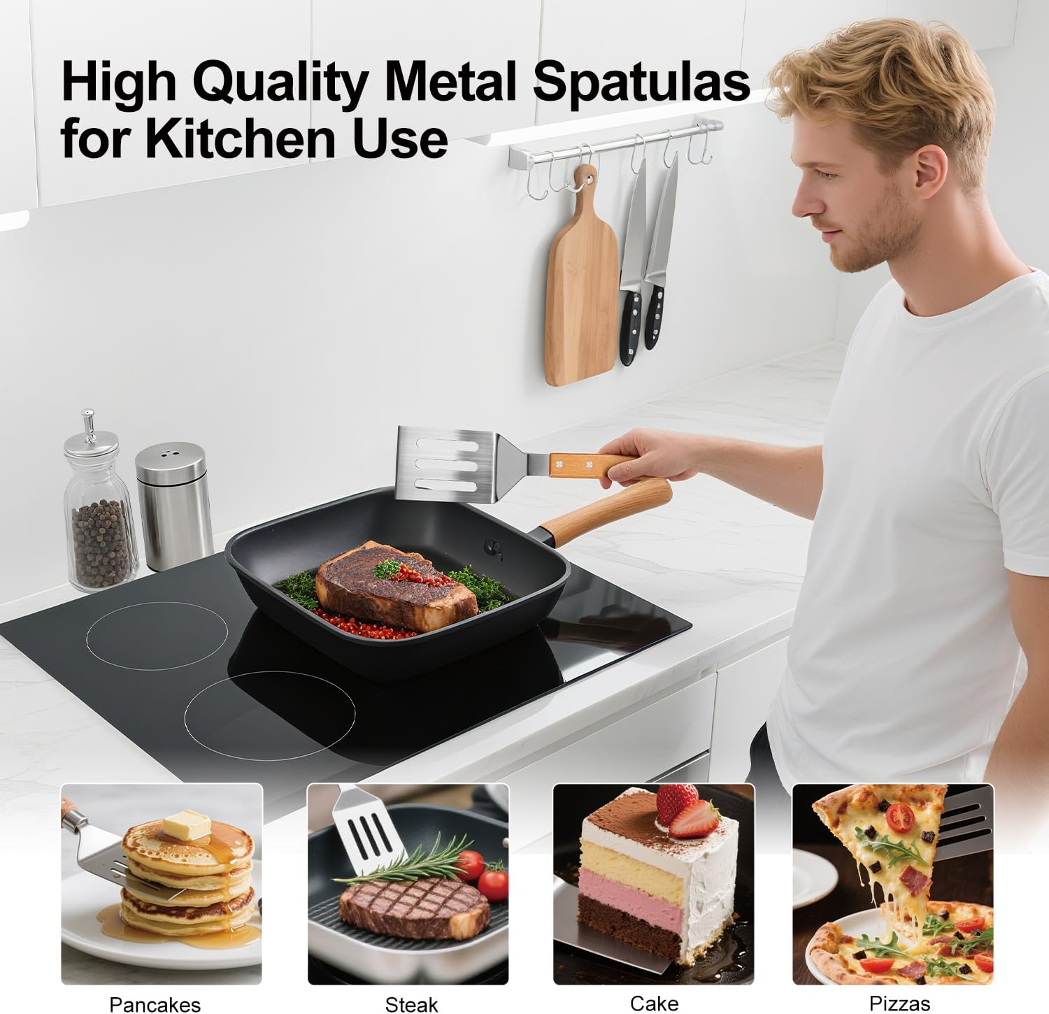 Stainless Steel Spatula Set, 2 Pcs Metal Spatulas for Kitchen Use, Professional Metal Spatula for Cast Iron Skillet with Wooden Handle, Ideal Choice for Making Desserts, Pancakes, Eggs, and BBQ