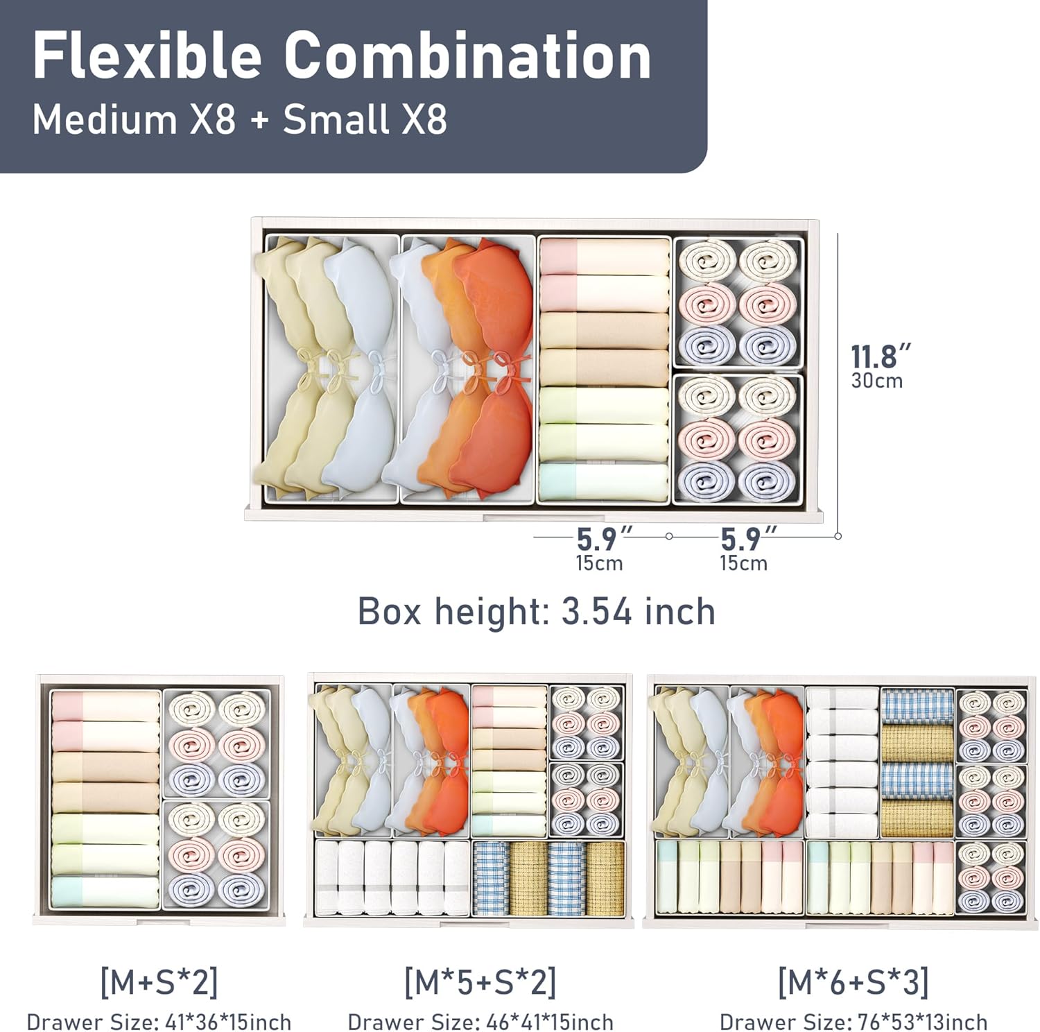 • Flexible Combination: This drawer organizer bins set includes 9 medium boxes (11.8" x 5.9" x 3.54"), and 9 small square boxes (5.9" x 5.9" x 3.54"), allowing for free combinations of 2 sizes for efficient and personalized organization