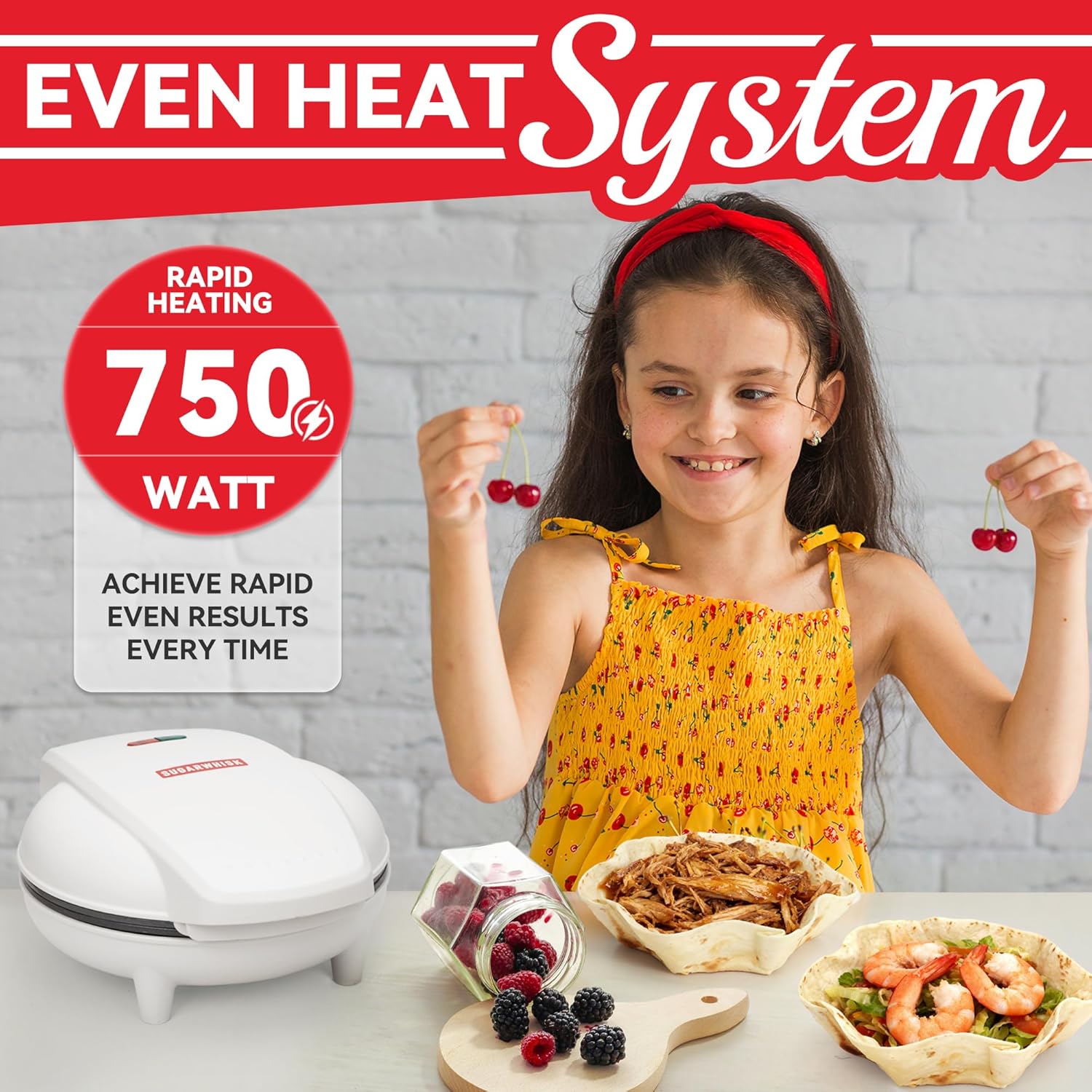 • [CREATIVE COOKING]: The tortilla maker will bring endless delicious ideas to your table.Whether to fill them with salad, cheese, ice cream, fruit, or meats, the versatile taco bowl shell maker offers endless delicious possibilities.