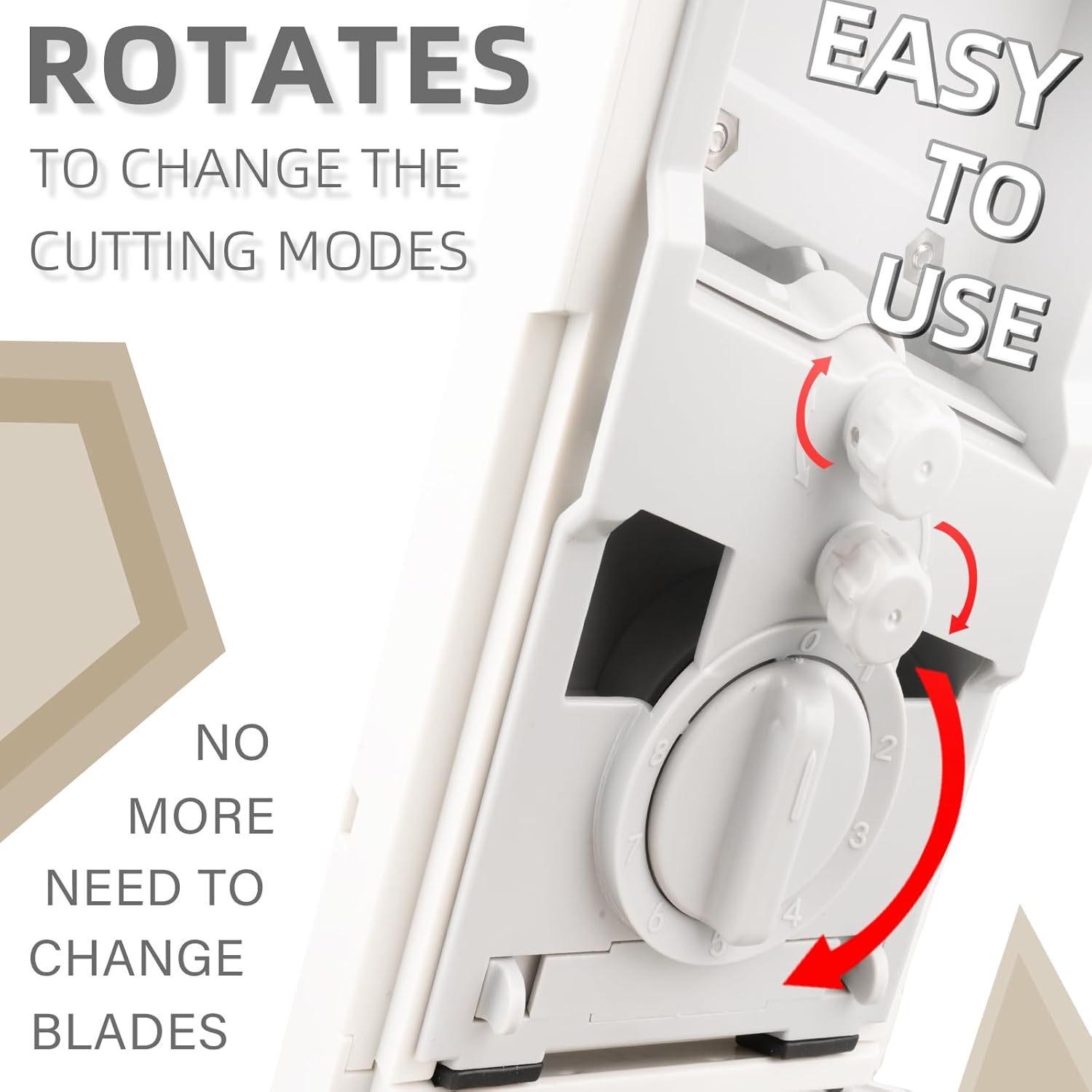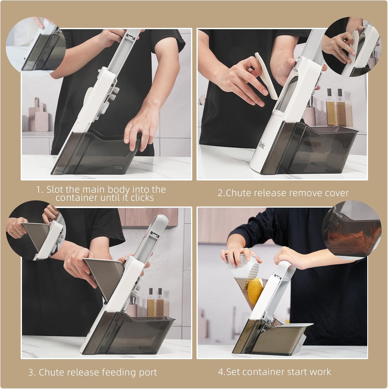 • TIP: If you want to cut the food into dice shapes, you need to slice it first, then cut it a second time. When cutting it a second time, please note that the sliced food should be placed flat inside, turn one or two small knobs (one knob will cut larger dice, two knobs will cut smaller dice), after the second cutting is completed, the dice come out.