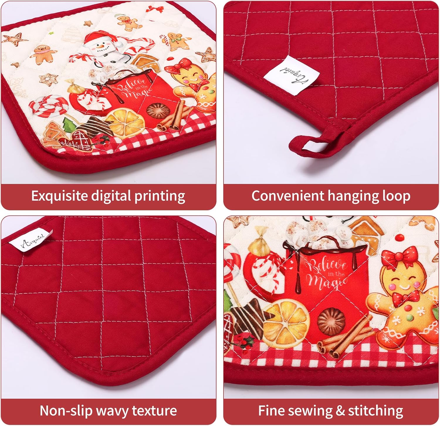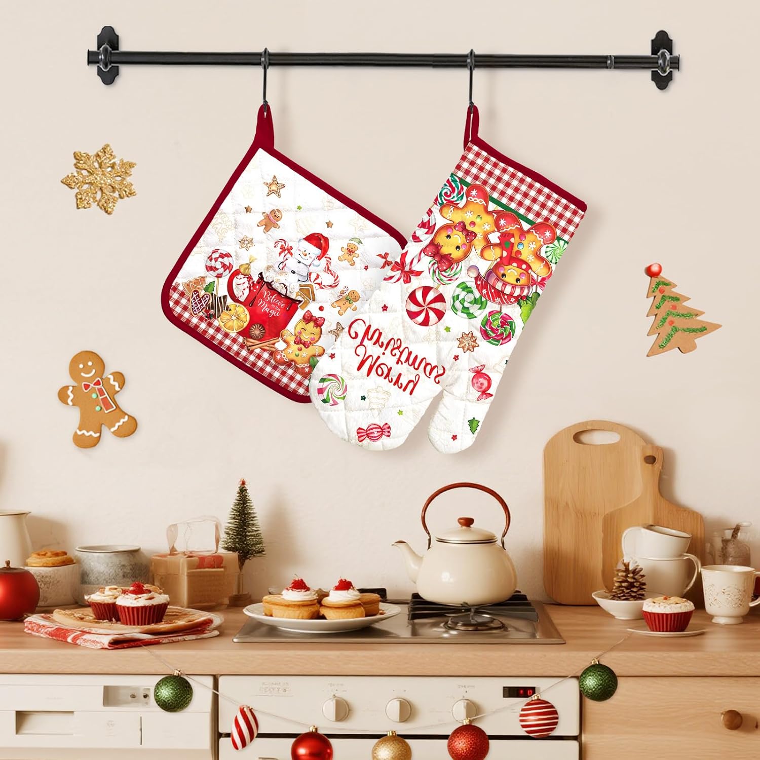 Christmas Gingerbread Oven Mitts and Pot Holders Sets 2Pcs, 100% Cotton Heat Resistant, Extra Long Oven Gloves Potholder for Kitchen Cooking Baking Decoration