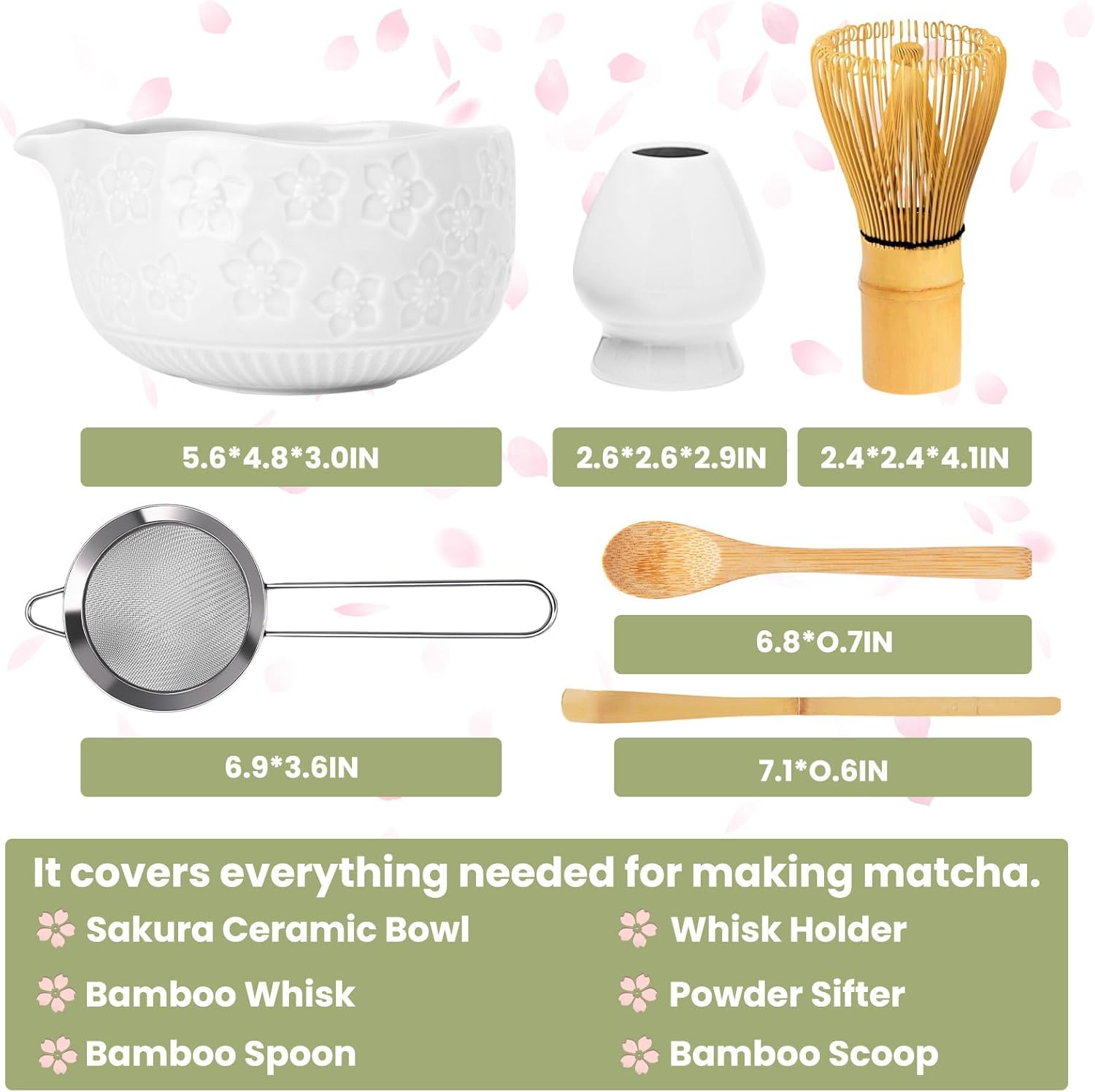 Matcha Whisk Set, Sakura White Ceramic Matcha Set Includes Matcha Bowl, Matcha Whisk (Chasen) and Holder, Sifter, Bamboo Scoop & Spoon - 6 Pcs Matcha Kit for Matcha Lovers