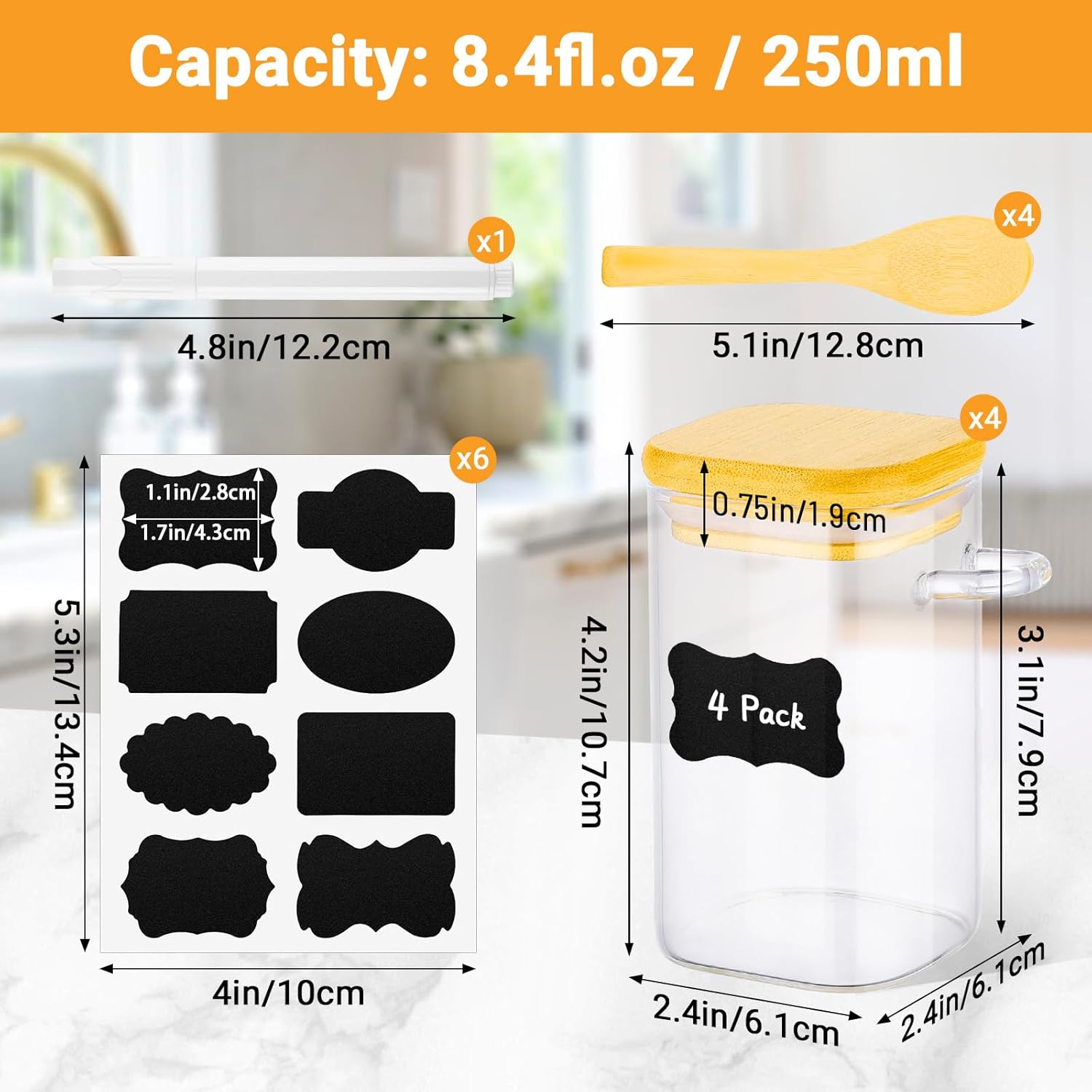 • Square Jar Canister Set Pack of 4: Kimqi food jars set includes 4 pack 8.5 fl.oz / 250ml glass storage jars with wood lids and spoon, each jar with a size of 2.4 x 3.9 inch (6cm x 10cm). The set also comes with 48 blank labels and 1 chalk marker for easy customization, which is great for pantry storage jar or kitchen countertop organization.