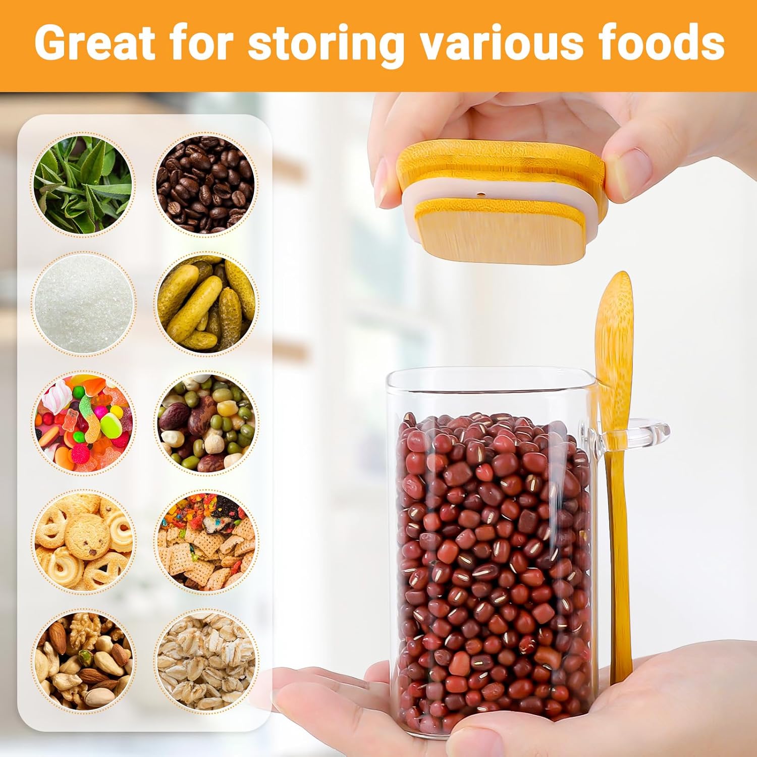 • Glass Jars with Airtight Lid: Each tea container features an airtight bamboo lid with silicone seal bamboo lid, keeps your food fresh and safe from moisture and dust. The matching wooden spoons are convenient for scooping food. In addition, the glass canister is designed with a small handle on the side, allowing you to conveniently place the spoons, keeping everything organized and easy to access.