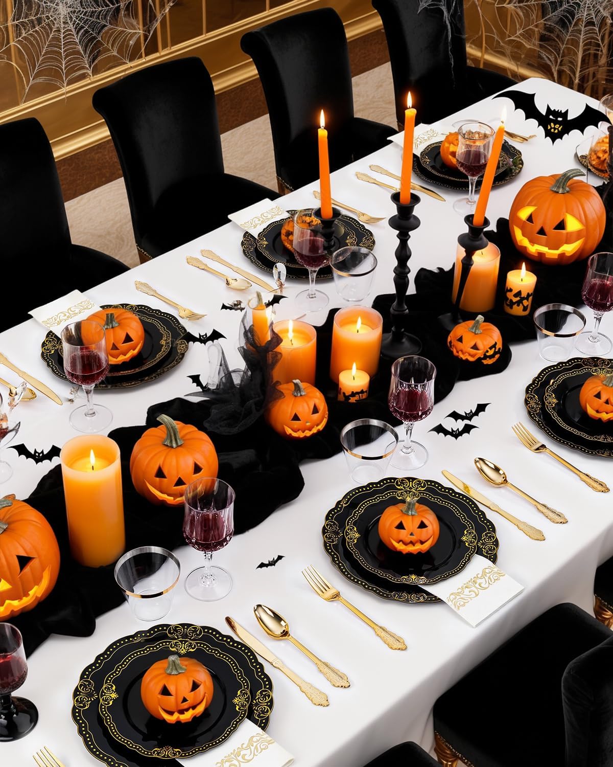 Ciaell 175 PCS Black and Gold Plastic Plates - Black Disposable Dinnerware Set with 50 Plates, 25 Knives, 25 Forks, 25 Spoons, 25 Cups, 25 Napkins for Halloween, New Year’s Day, Parties and Weddings