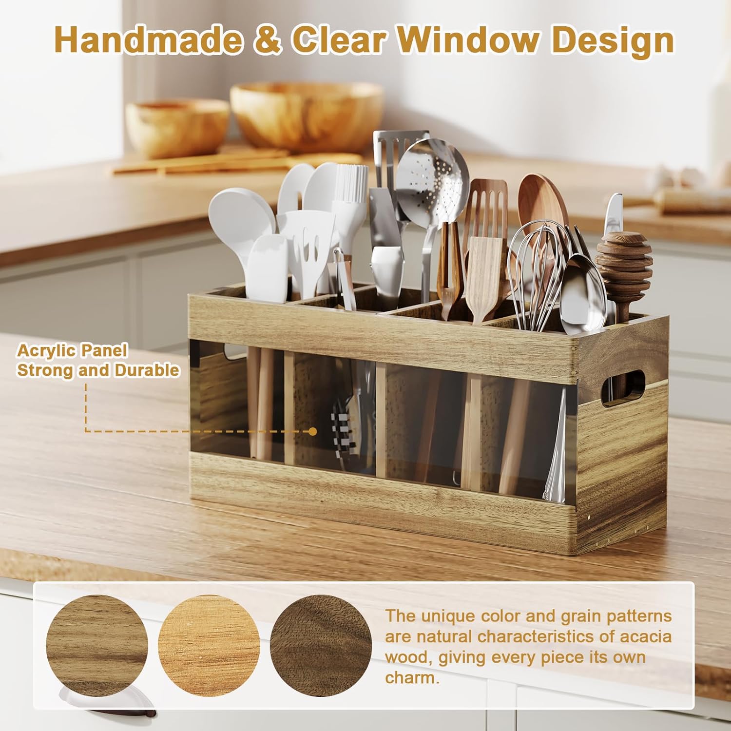 • · Premium Acacia Wood Utensil Holder – Made from high-quality acacia wood with a smooth varnish finish, providing durability, moisture resistance, and a natural rustic look for your kitchen countertop.