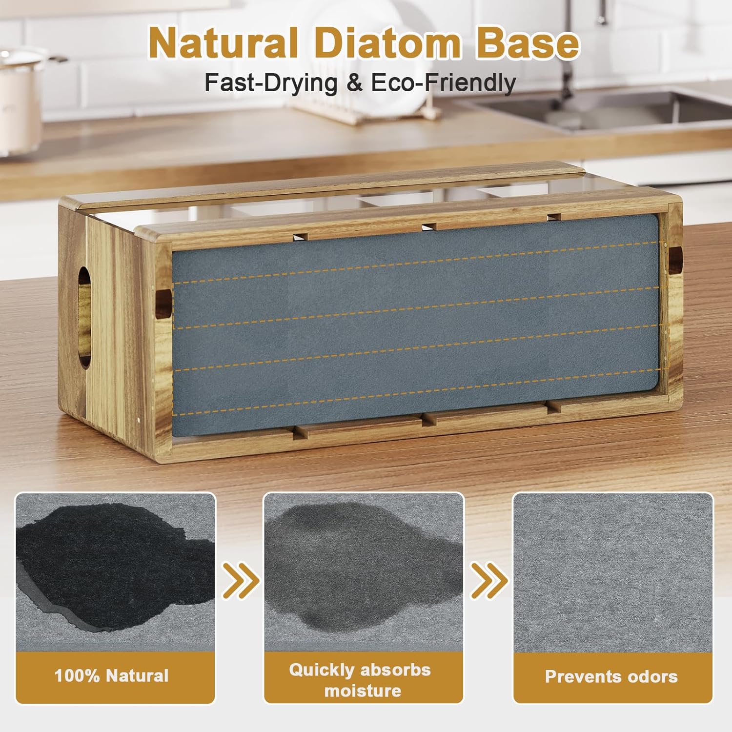• · Diatomaceous Earth Moisture-Absorbing Base – Each compartment features a diatomite pad that absorbs excess moisture, keeping utensils dry, hygienic, and ready for use.