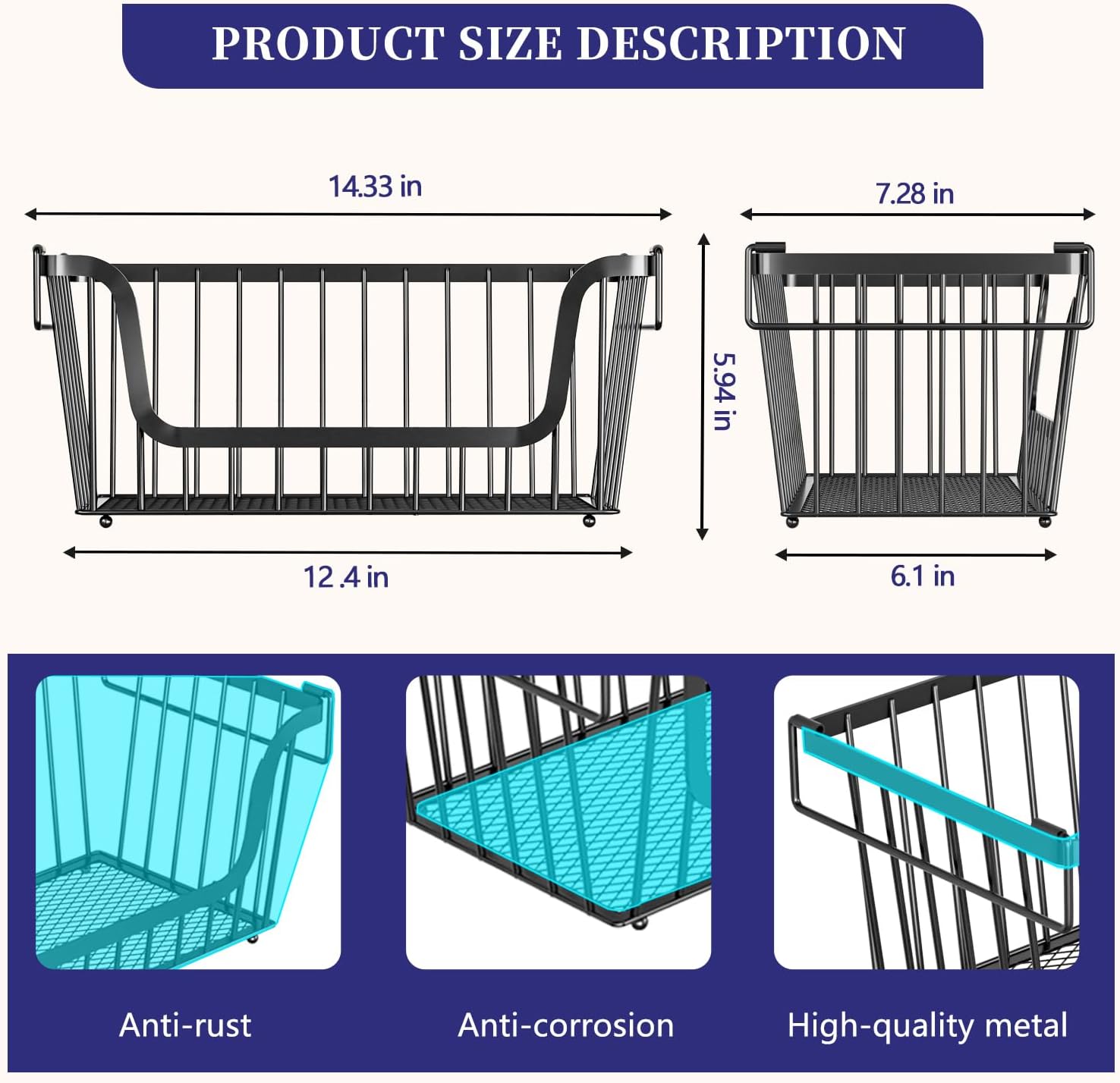 • Upgraded U-Shaped Large Opening: For metal baskets on storage shelves, for easier access to items when stacked. The front of each metal basket is designed with a large U-shape opening, which not only maintains the unique aesthetics but also upgrades the practicality. It can stackable shelf baskets more convenient for you and your family to use.