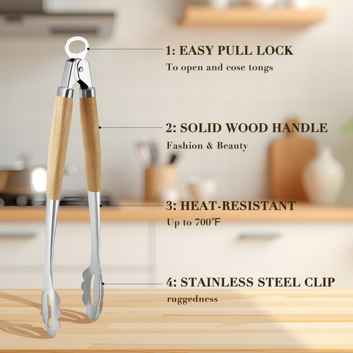 KULUNER Stainless Steel Barbecue Tongs with Solid Wood Handle, Kitchen Metal Locking Design, Extra Long 17.5 Inches 700 Degrees, Suitable for Food Cooking, Salad and Outdoor Grilling(Beechwood)