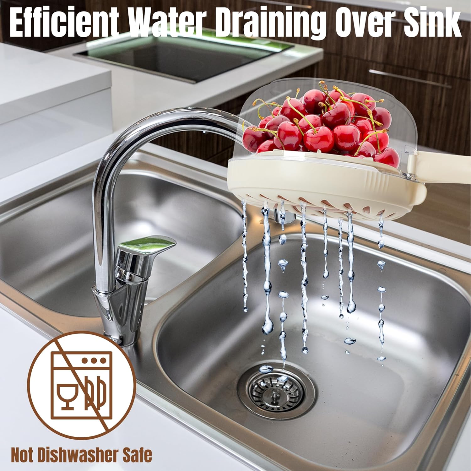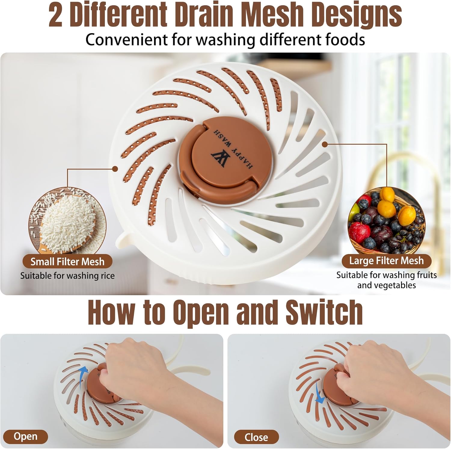 • Efficient Cleaning and Drainage – This compact brown colander features built-in drainage functionality, designed with two different drainage holes. It can be used to rinse fruits and vegetables as well as rice, quickly removing excess moisture. The foldable handle ensures it stays securely in your hand during drainage.