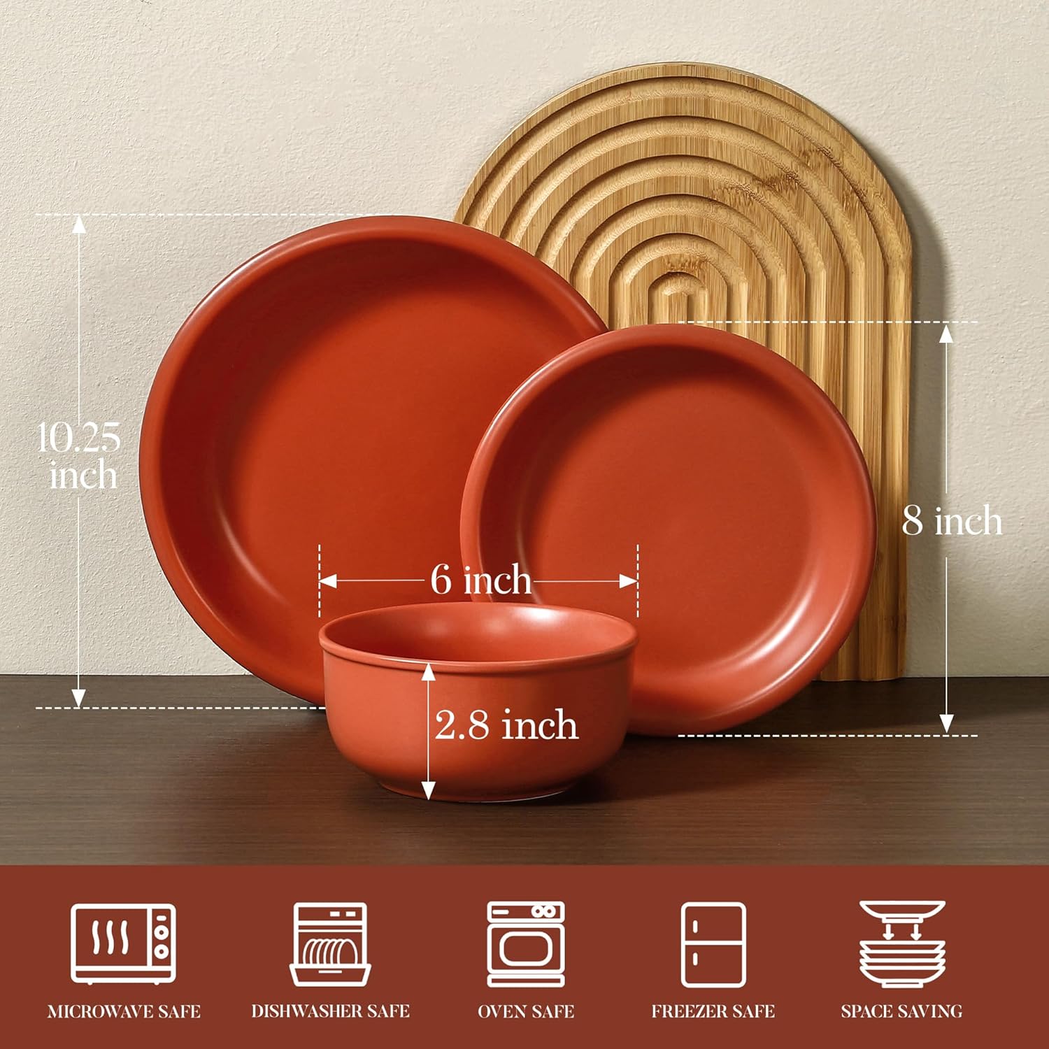 GZG Vintage Series - Ceramic Dinnerware Set for 8, 24 Pieces Stoneware Plates and Bowls Set, Lead-Free, Handcrafted Dishes Set, Microwave & Dishwasher Safe - Terracotta Red