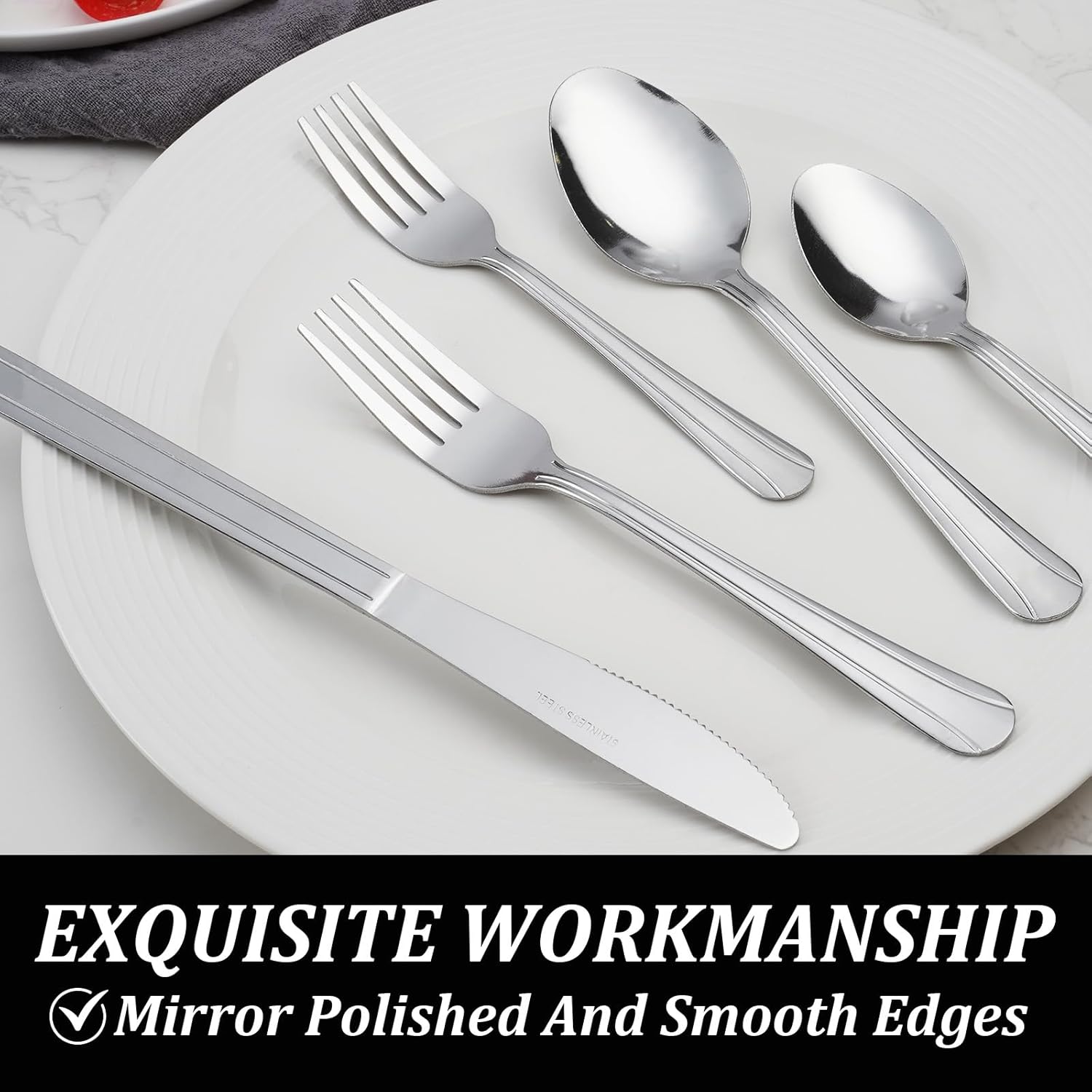 • 【MULTIFUNCTIONAL】:This shiny silver flatware set is perfect for Thanksgiving Day, Mother's Day, Housewarming, Wedding, Restaurant, Hotel or Daily Use. Simple classic modern design would match well with your existing cutlery and elevate everyday meals into a fine dining experience.