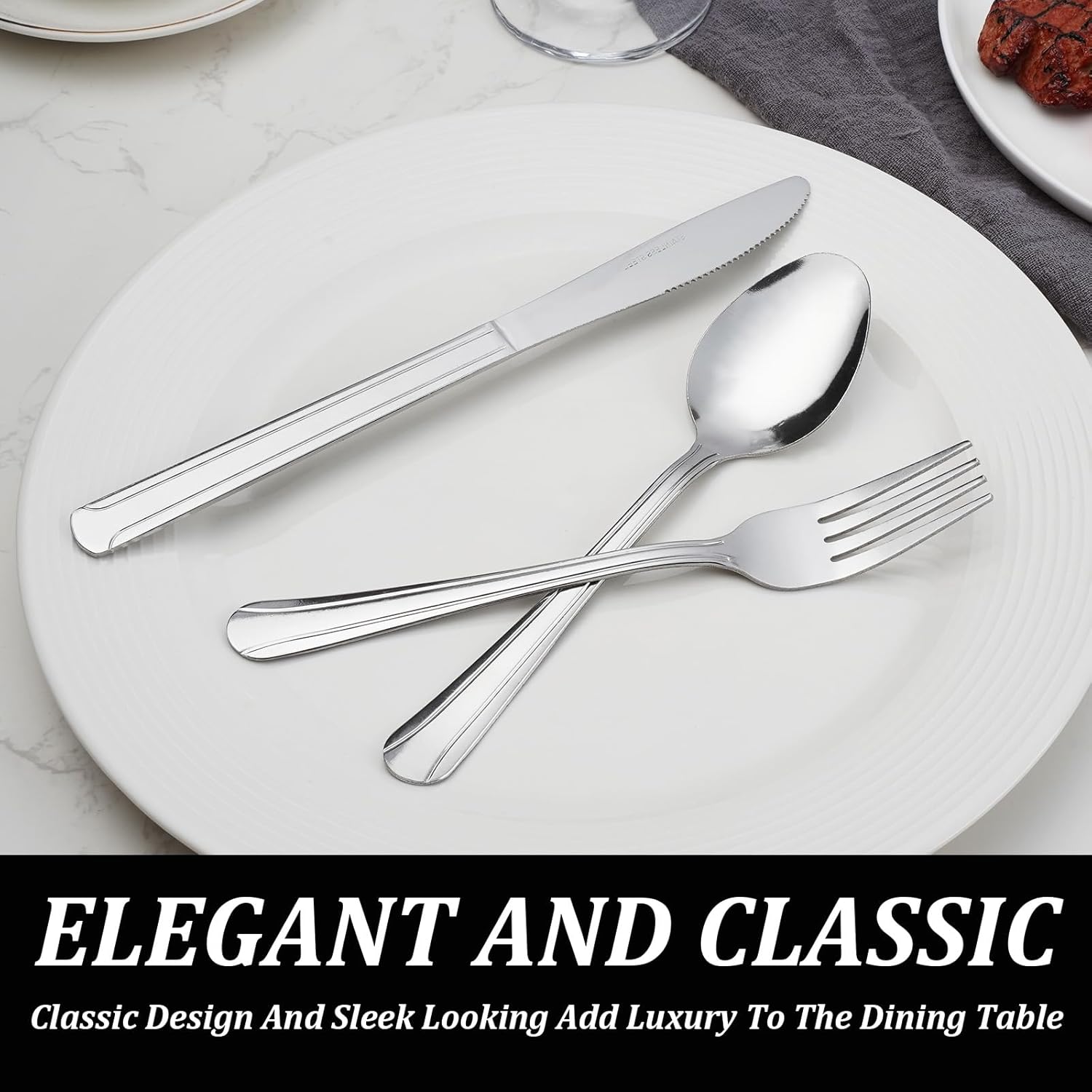 • 【MULTIFUNCTIONAL】:This shiny silver flatware set is perfect for Thanksgiving Day, Mother's Day, Housewarming, Wedding, Restaurant, Hotel or Daily Use. Simple classic modern design would match well with your existing cutlery and elevate everyday meals into a fine dining experience.