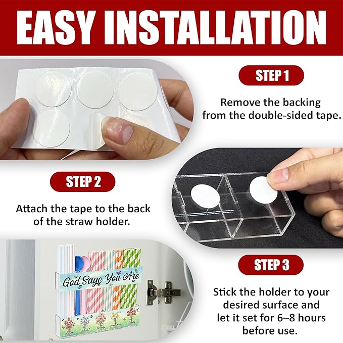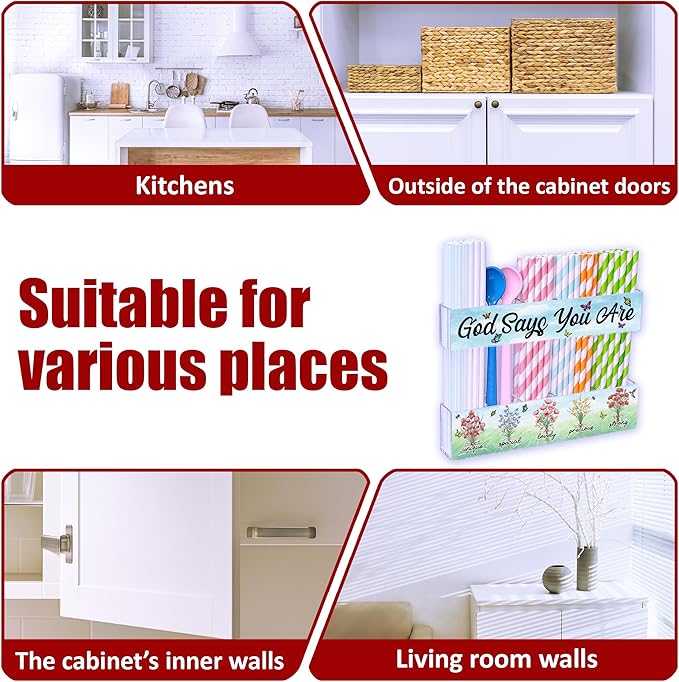 • 2-Piece Adjustable Design for Flexible Storage: Features top (7.9 x 1.57 x 0.98 in) and bottom (7.9 x 1.97 x 0.98 in) panels to fit various straw lengths. Includes 10 strong double-sided adhesive pads for secure, drill-free mounting on cabinet doors or walls.