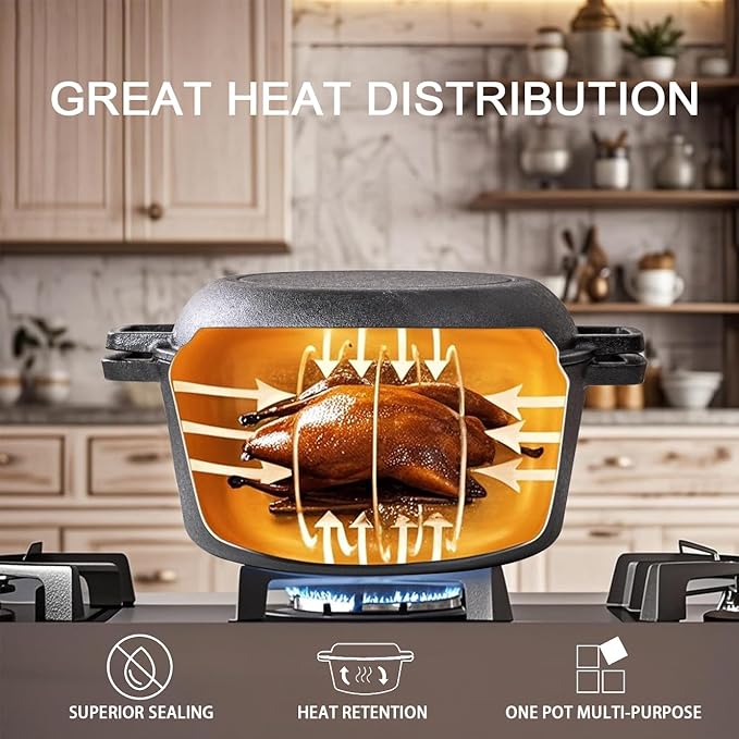 • Incredibly Versatile: From Stovetop to Oven: This multifunctional cast iron pot is a true kitchen workhorse. The flat bottom is perfect for searing steaks in your cast iron skillet with lid, while the rounded base excels at braising, stewing, and even bread baking. Use it to fry, simmer, roast, and bake—all in one Dutch oven cast iron pot.