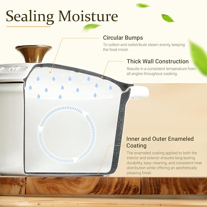 • Effortless Cleaning & Safety First: The flat and smooth enamel surface not only delivers a superior cooking experience but also makes cleaning a breeze. Easily remove food residues with a gentle wipe from a soft sponge or cloth. Additionally, we've included a cotton heat-resistant cap, ensuring a comfortable grip and safeguarding you from burns when handling the pot's handles and lid.