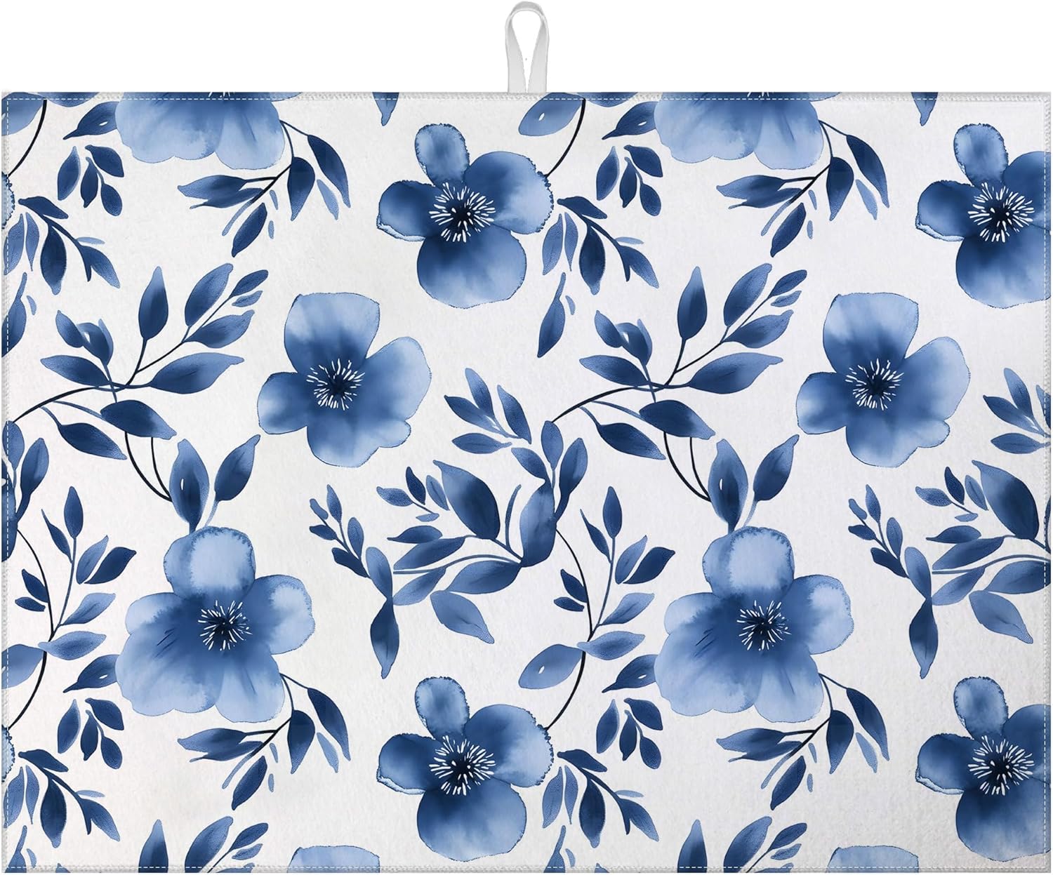 Blue Floral Dish Drying Mat for Kitchen Counter Flower Leaves Drying Pad Absorbent Reversible Dish Drainer Rack Mats Draining Pad 18"x24"Inch