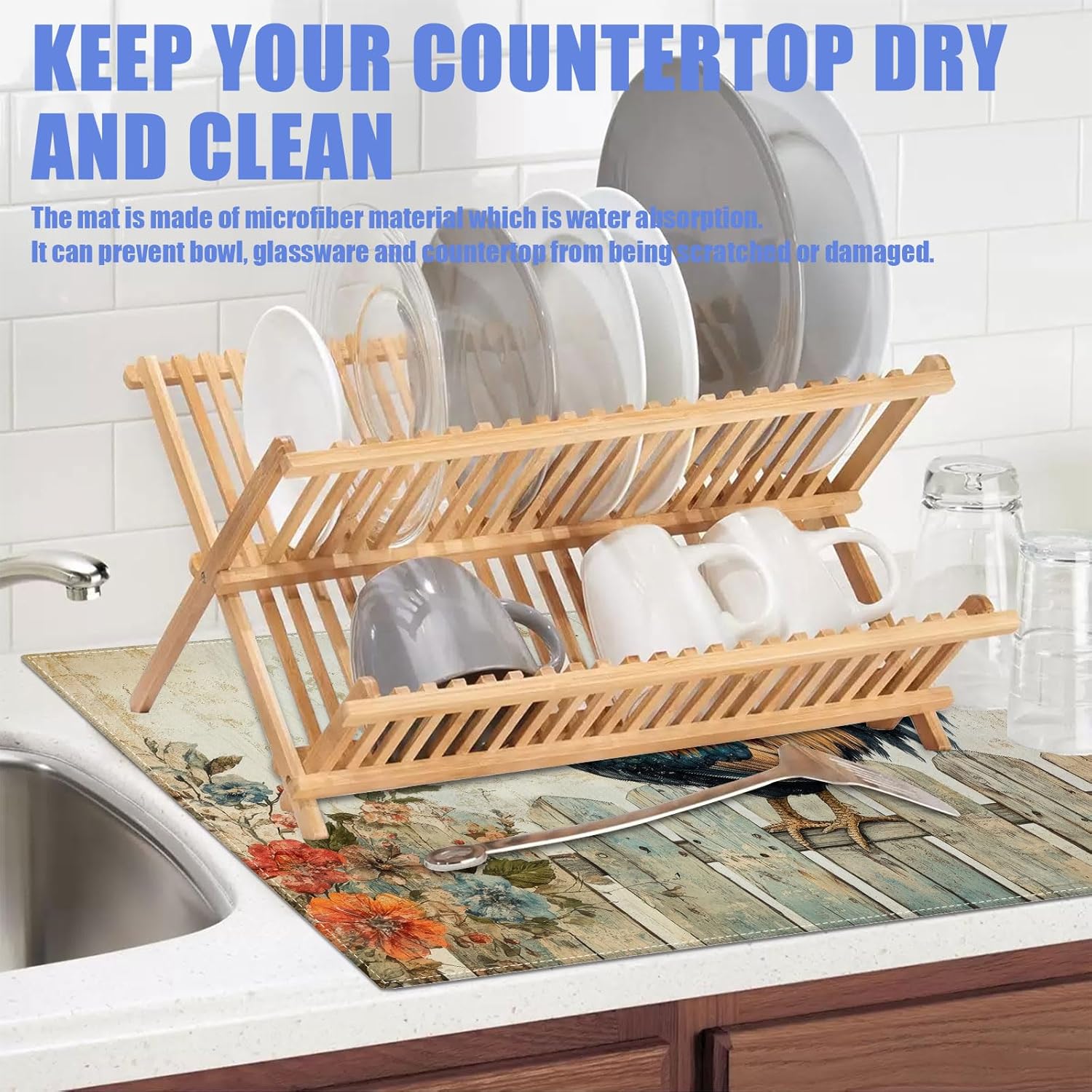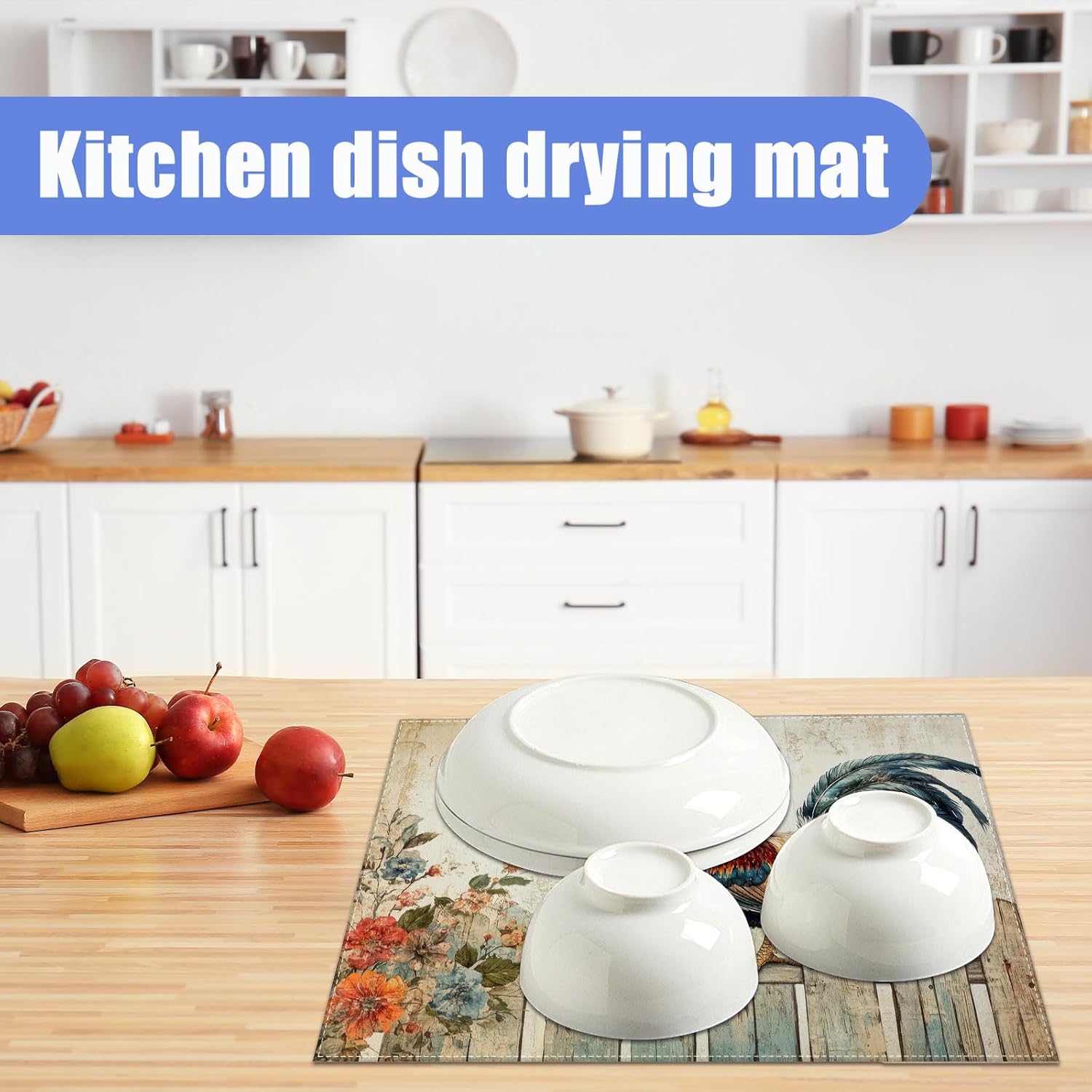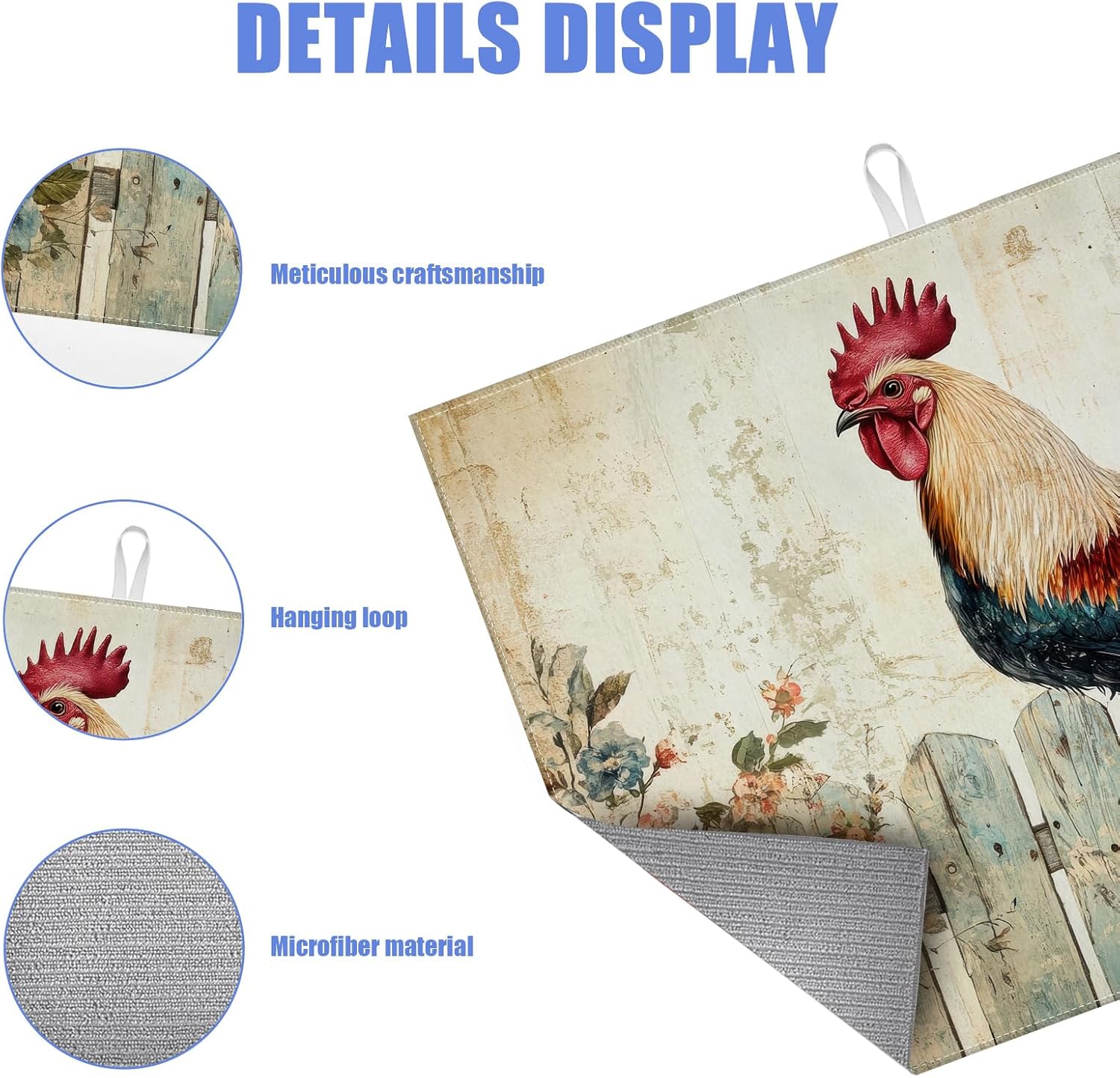 Vintage Rooster Dish Drying Mat for Kitchen Counter Farmhouse Drying Pad Absorbent Reversible Dish Drainer Rack Mats Draining Pad 18"x24"Inch