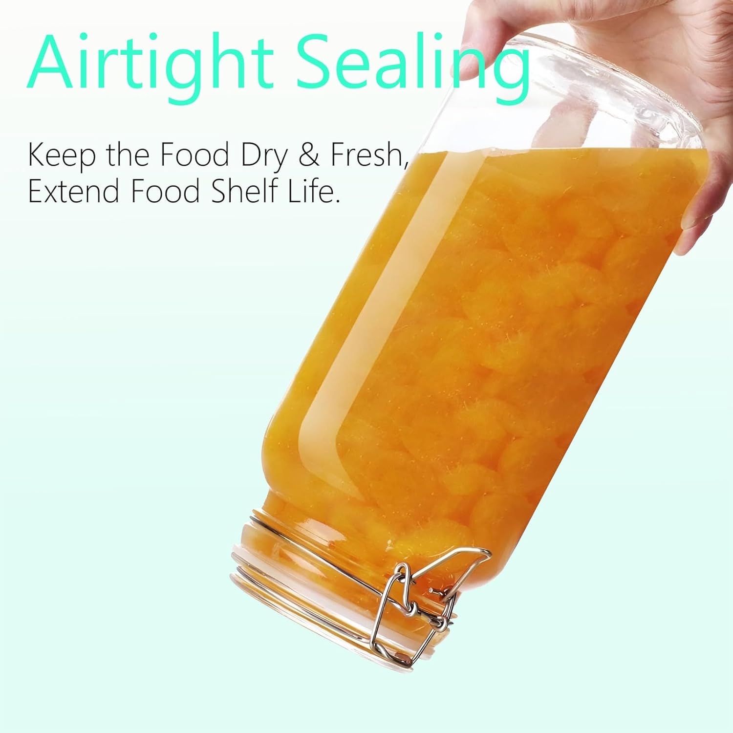 • 2.Airtight Seal Lids — Glass jars with airtight lid is made of food-graded glass; Each kitchen canisters for countertop is well sealed, equipped with silicone gasket and a stainless iron locking clamp to make sure your food stay clean and fresh in storage