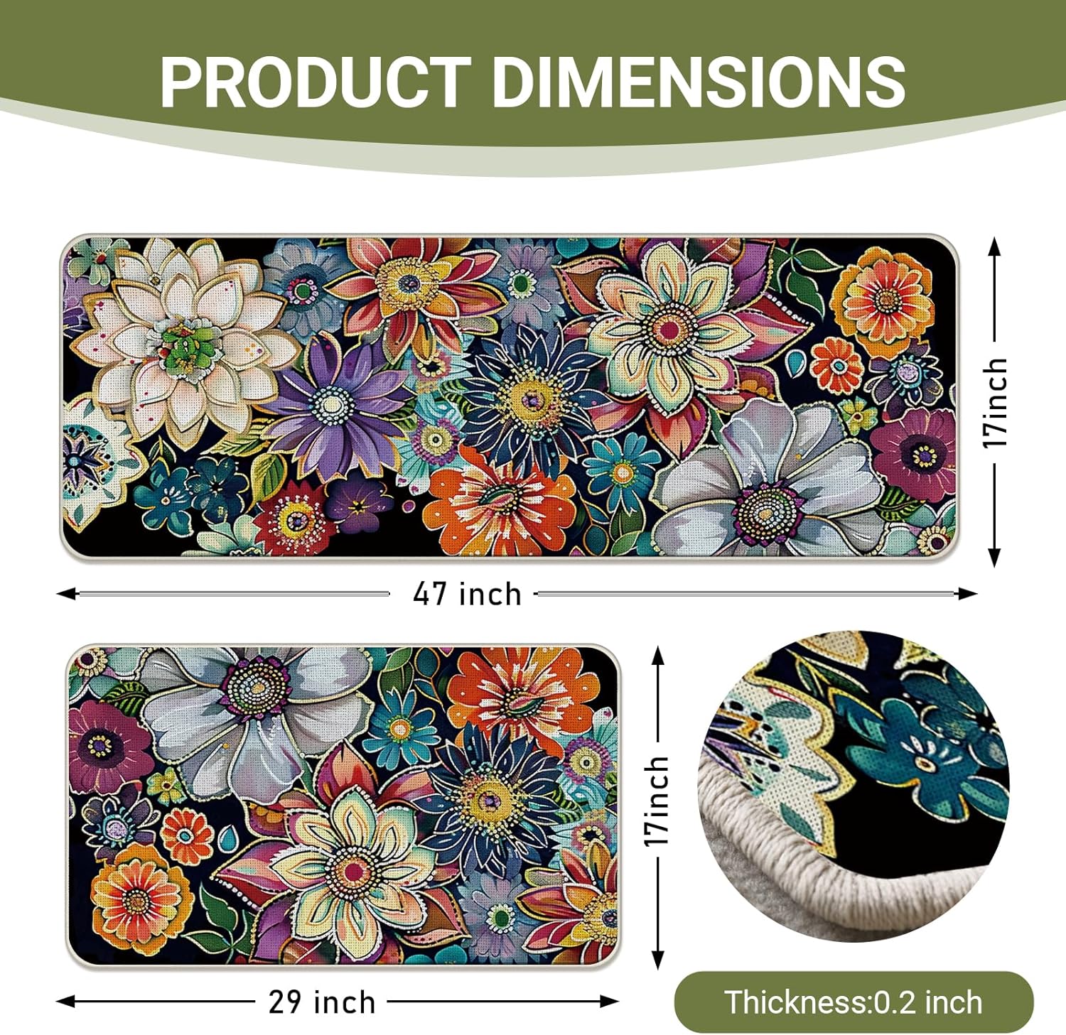 Boho Vintage Floral Kitchen Rugs Set of 2, Colorful Retro Flowers Floor Mats Decor, Bohemian Botanical Door Mat Home Decorations - 17x29 and 17x47 Inches