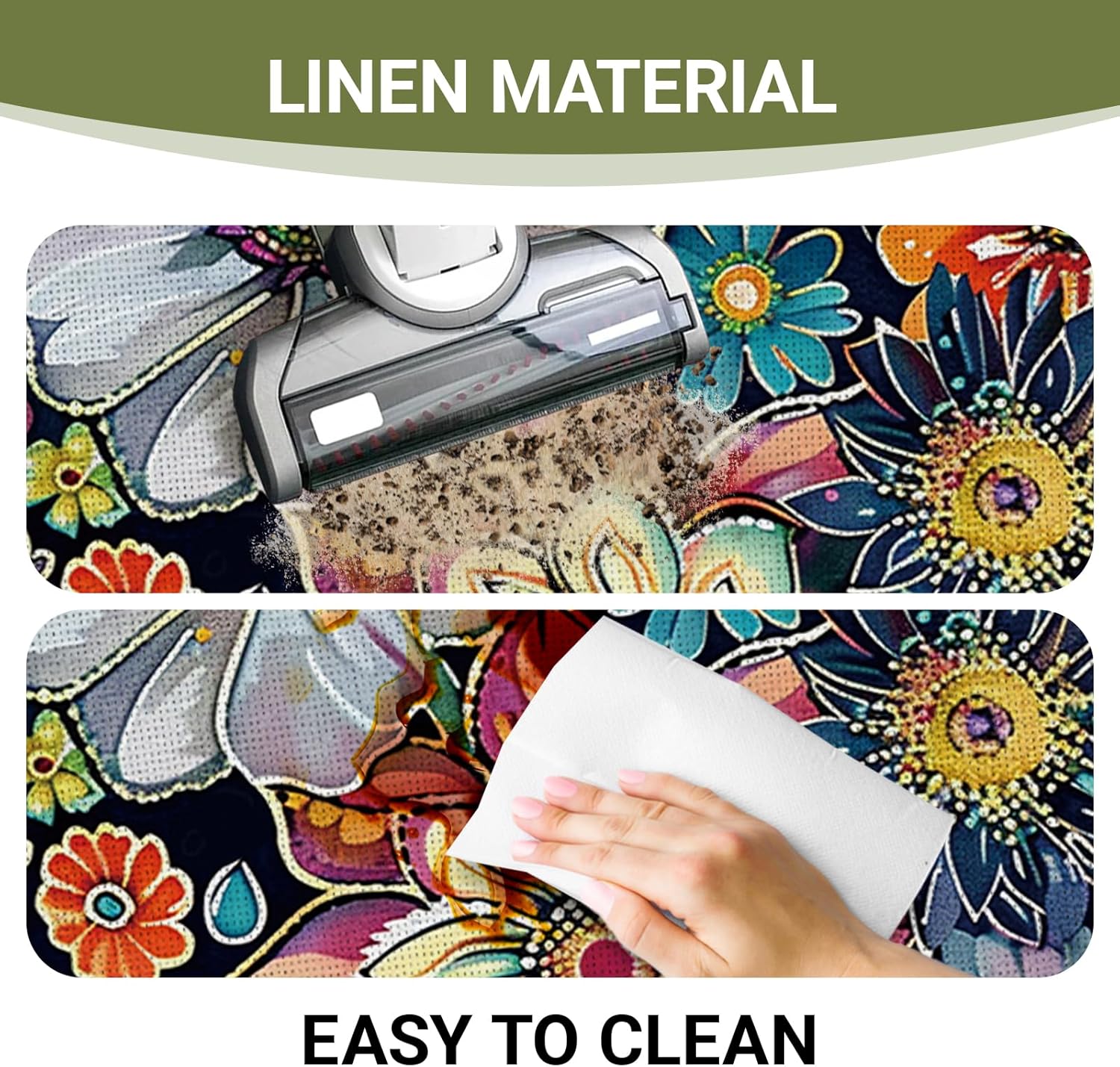 • Easy To Clean: Cleaning kitchen carpets is quick and easy, just spray with a hose or use a sponge and mild detergent to remove dirt. Do not bleach or dry clean, do not wring and let it air dry. Our washable kitchen rugs are rigorously tested to ensure they last for a long time and retain their shape after washing