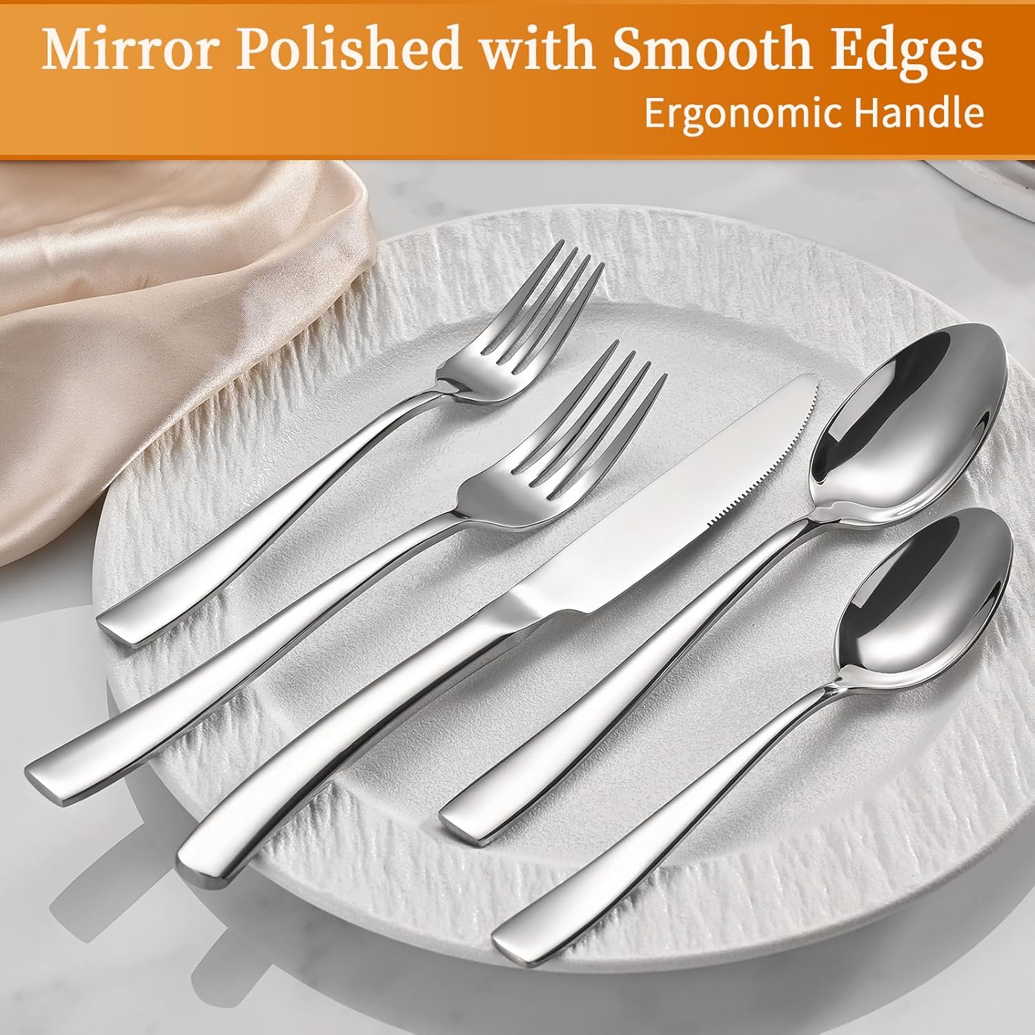 • Elegant Design: This is a very modern art style silverware set, clean lines, highly mirror polished, smooth edges, free of rough spots and edges, unique and elegant appearance would match well with your existing eating utensils, enhance your dining experience.