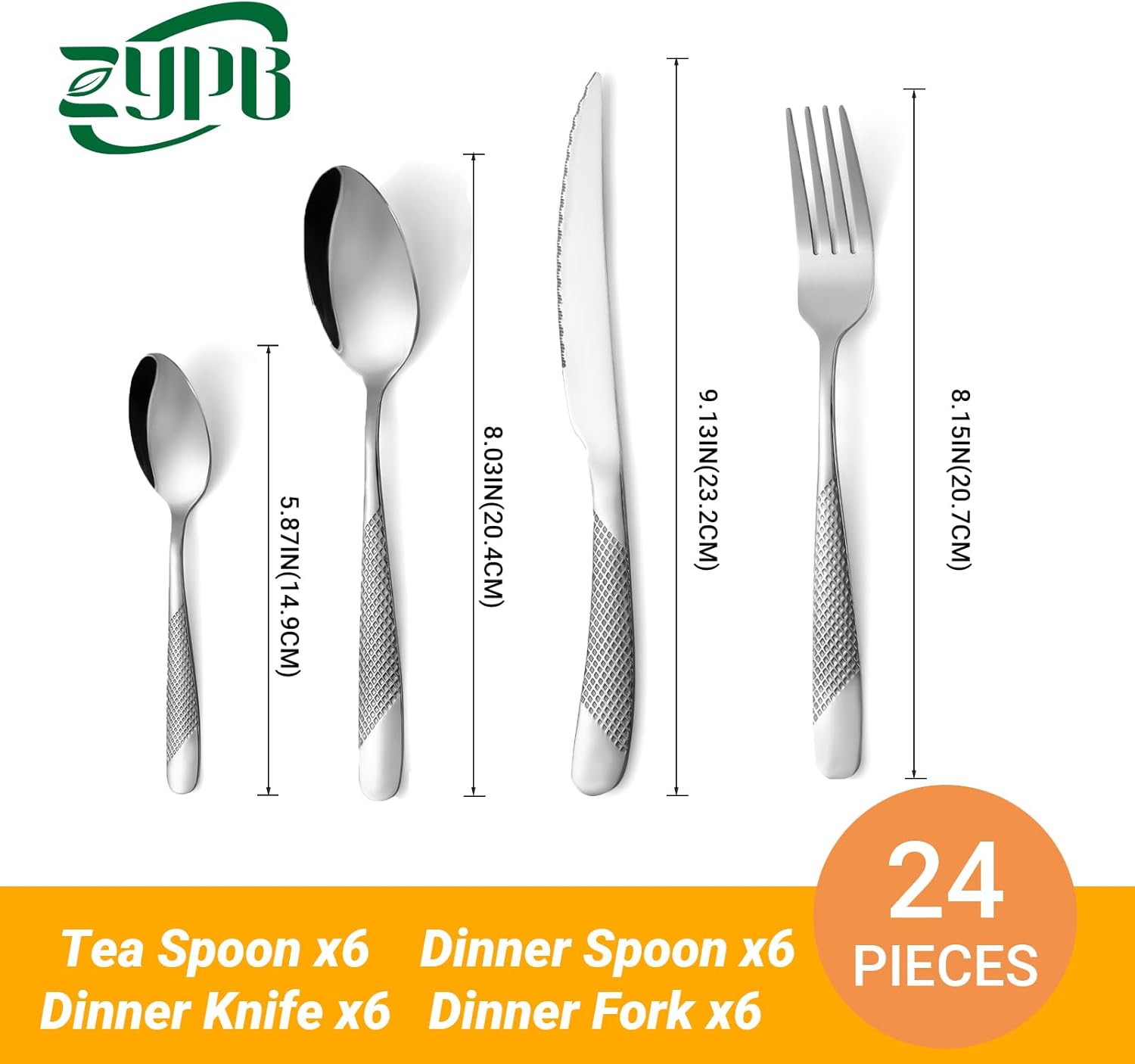 • Complete Silverware Set for 6:24-piece flatware set includes 6 dinner forks, 6 dinner knives, 6 dinner spoons, and 6 dessert spoons. Perfect for daily meals with family or hosting small gatherings.