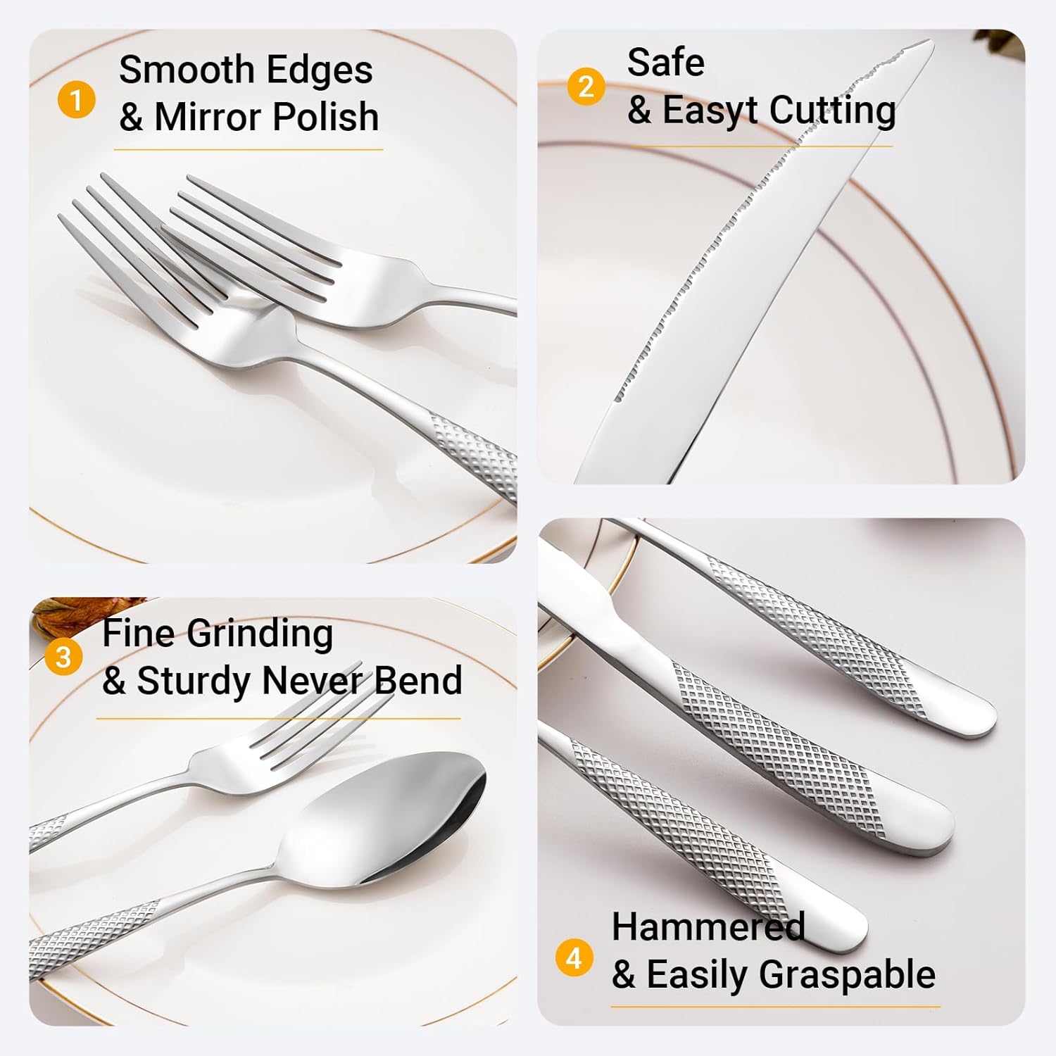 24-Piece Silvery Hammered Silverware Set, Food-Grade Stainless Steel Flatware Service for 6, Modern Cutlery Utensil Set with Forks Knives Spoons, Mirror Polished, Dishwasher Safe for Dining Restaurant