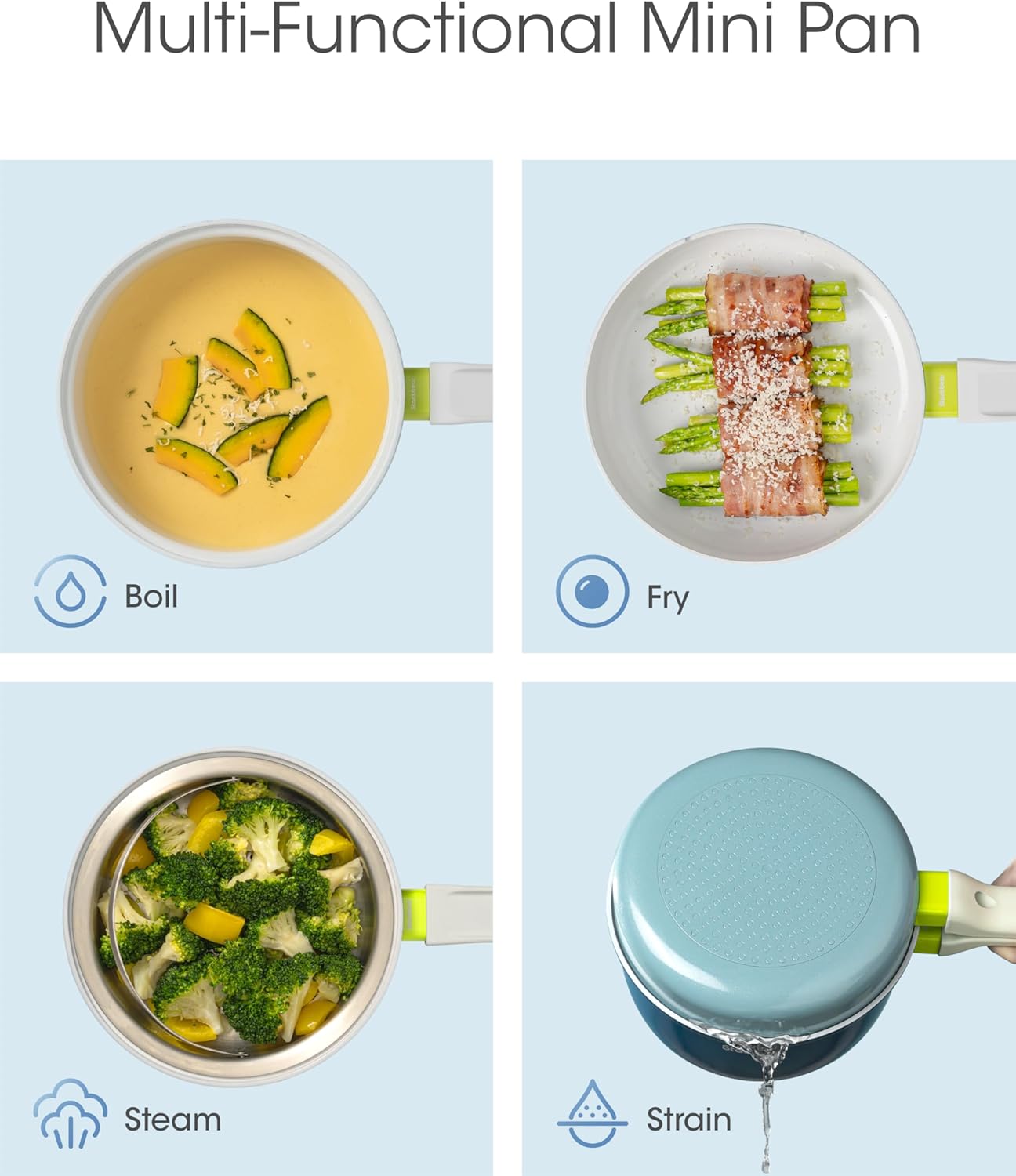 Ceramic Non Stick Cookware Set, 2.5QT Saucepan, 7" Egg Omelette Pan & 18/10 Stainless Steel Steamer, Induction Ready Frying & Sauce Pan Set, PTFE, PFOA & PFAS Free, Mix Blue