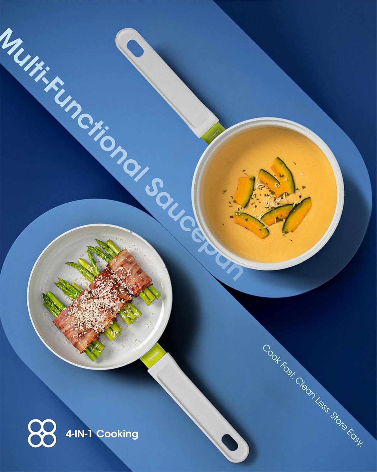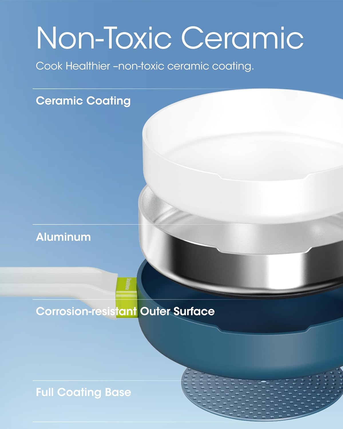 • Non-Toxic Non-Stick Coating: Our cooking pot features a PTFE, PFOA, and PFAS free ceramic non-stick coating, ensuring safe and healthy cooking without harmful chemicals. This non-stick coating ensures food doesn’t easily stick to the bottom, making them ideal for cooking pasta, sauces, oatmeal, and more. Enjoy hassle-free cooking and better food release.