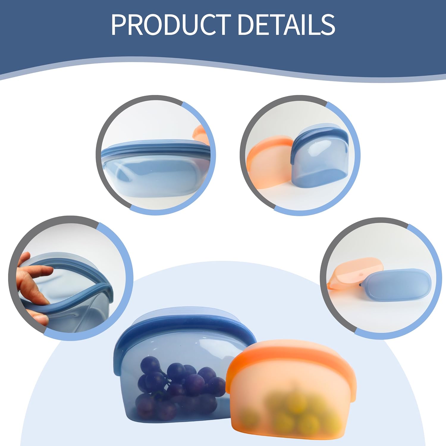 Silicone Storage Bags Reusable Food Storage bag 34oz/17oz 2pcs Dual-Zip Leakproof Seal Wide Stand-Up Base Dual-Texture Dishwasher & Microwave Safe, BPA Free