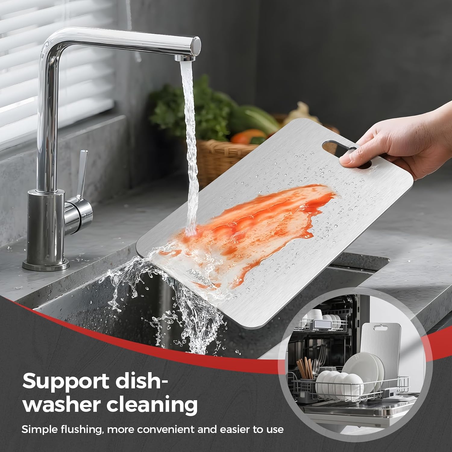 • 【Sturdy and Durable】: Engineered from a single piece of titanium without any glue or adhesives, these cutting boards are non-toxic and built for long-lasting durability. They can withstand the rigors of daily use, being highly resistant to notches and punctures from sharp knives. The wire-drawn surface treatment creates a smooth, pore-free finish that resists staining and odor absorption