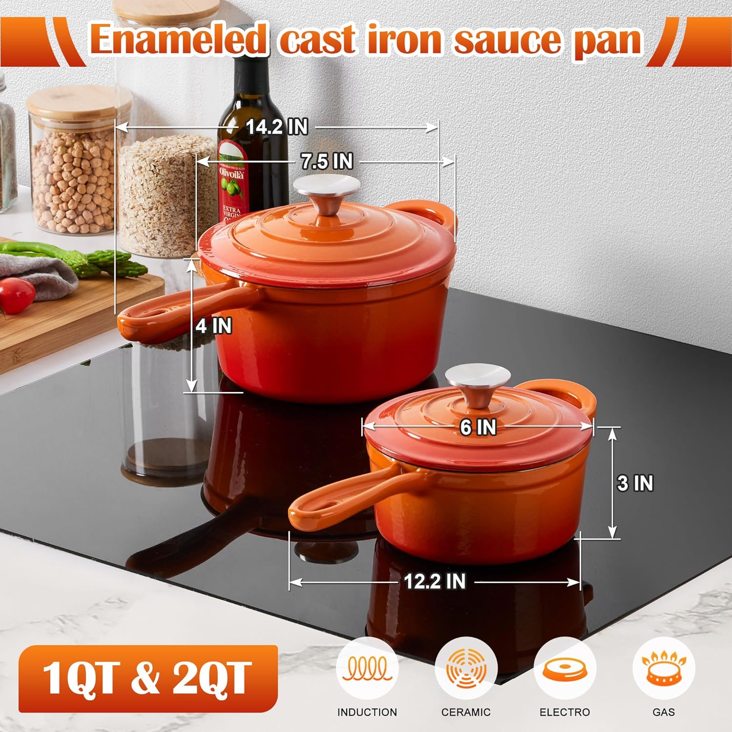 E-far Sauce Pan Set with Lid, 1Qt & 2Qt Enameled Cast Iron Pot Sets for Kitchen Cooking, Small Heavy Duty Dutch Oven Saucepans & Self-basting Lids, Induction-Ready & Easy Clean, Orange