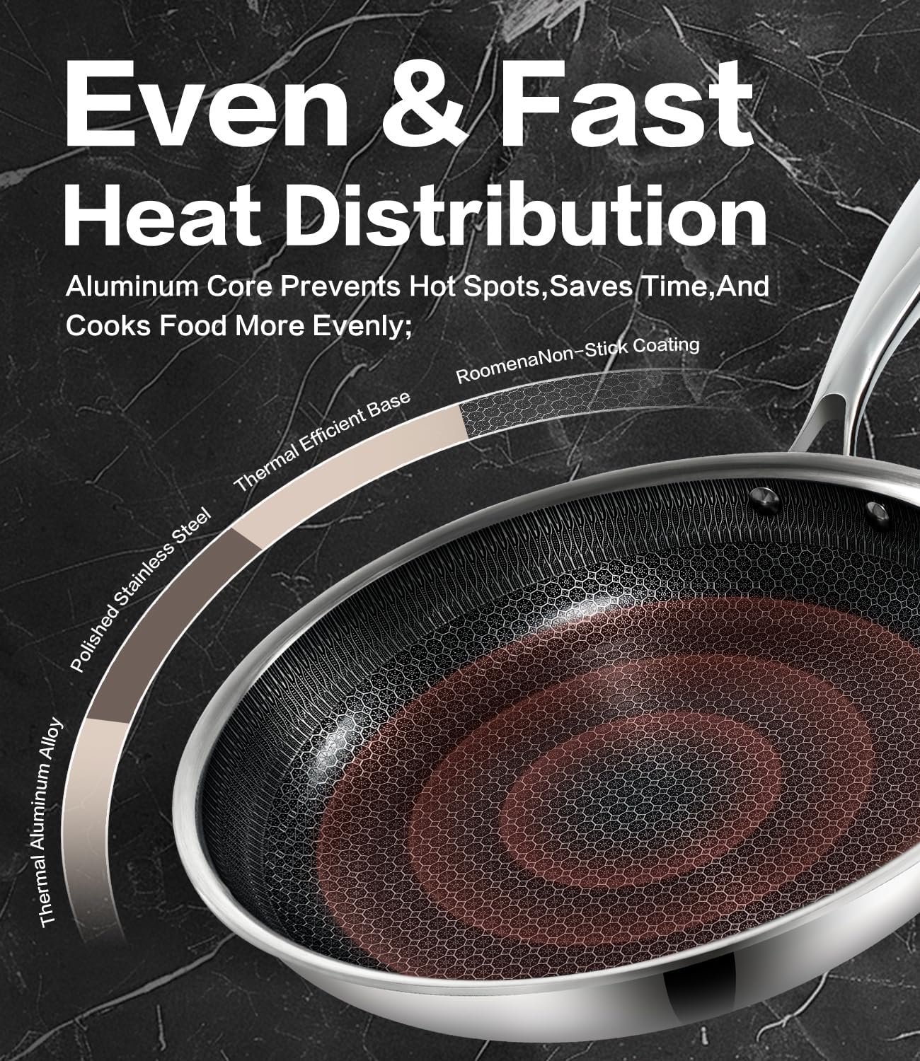 • Revolutionary Smooth Stainless Steel – Crafted with Food-grade 304 stainless steel, our innovative non-toxic frying pan features a perfectly smooth base that enhances thermal conductivity by 30% while reducing smoke by 52%. Unlike traditional etched cookware, this non stick frying pans design ensures effortless cleaning with zero residue, maintaining kitchen cleanliness effortlessly