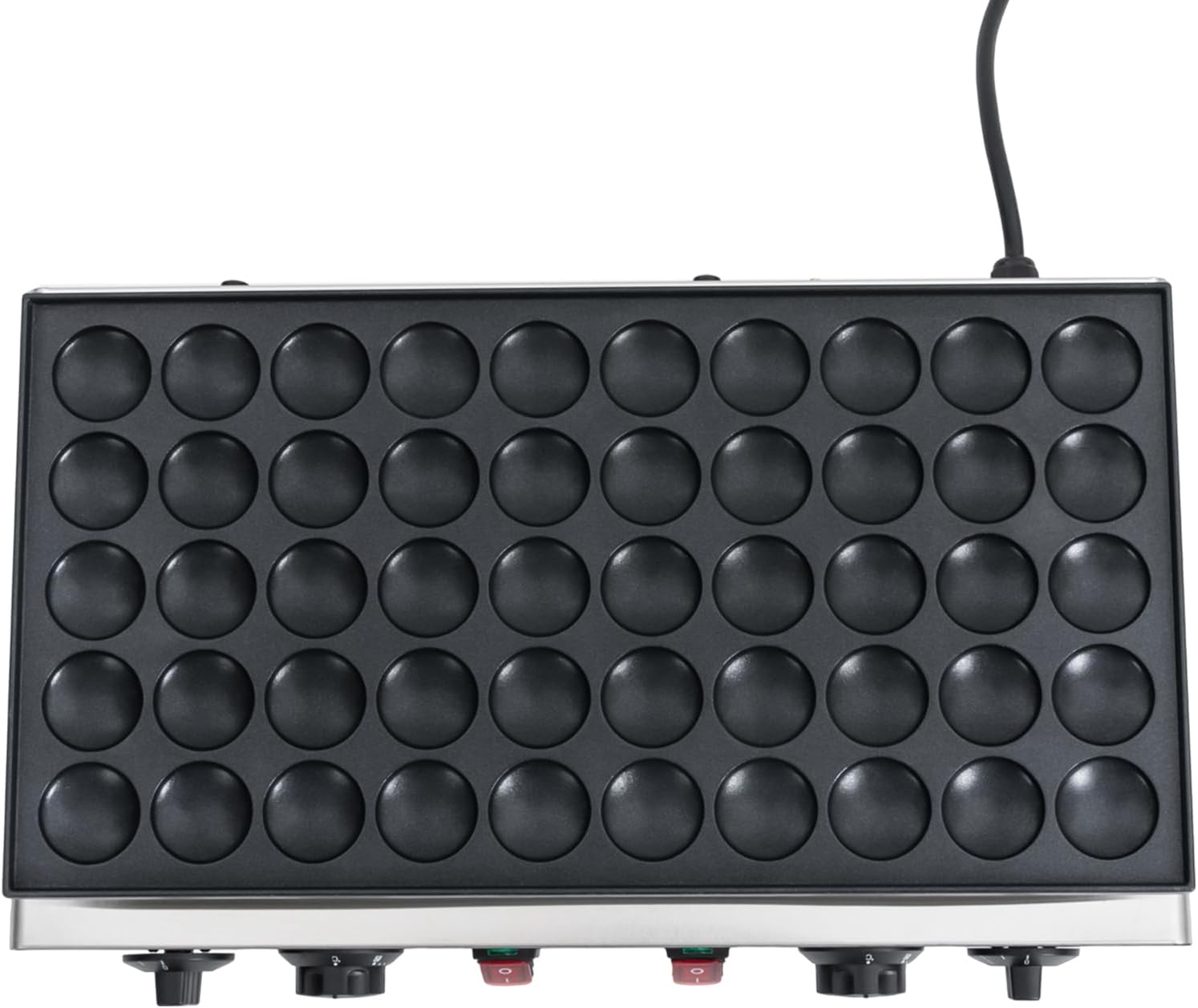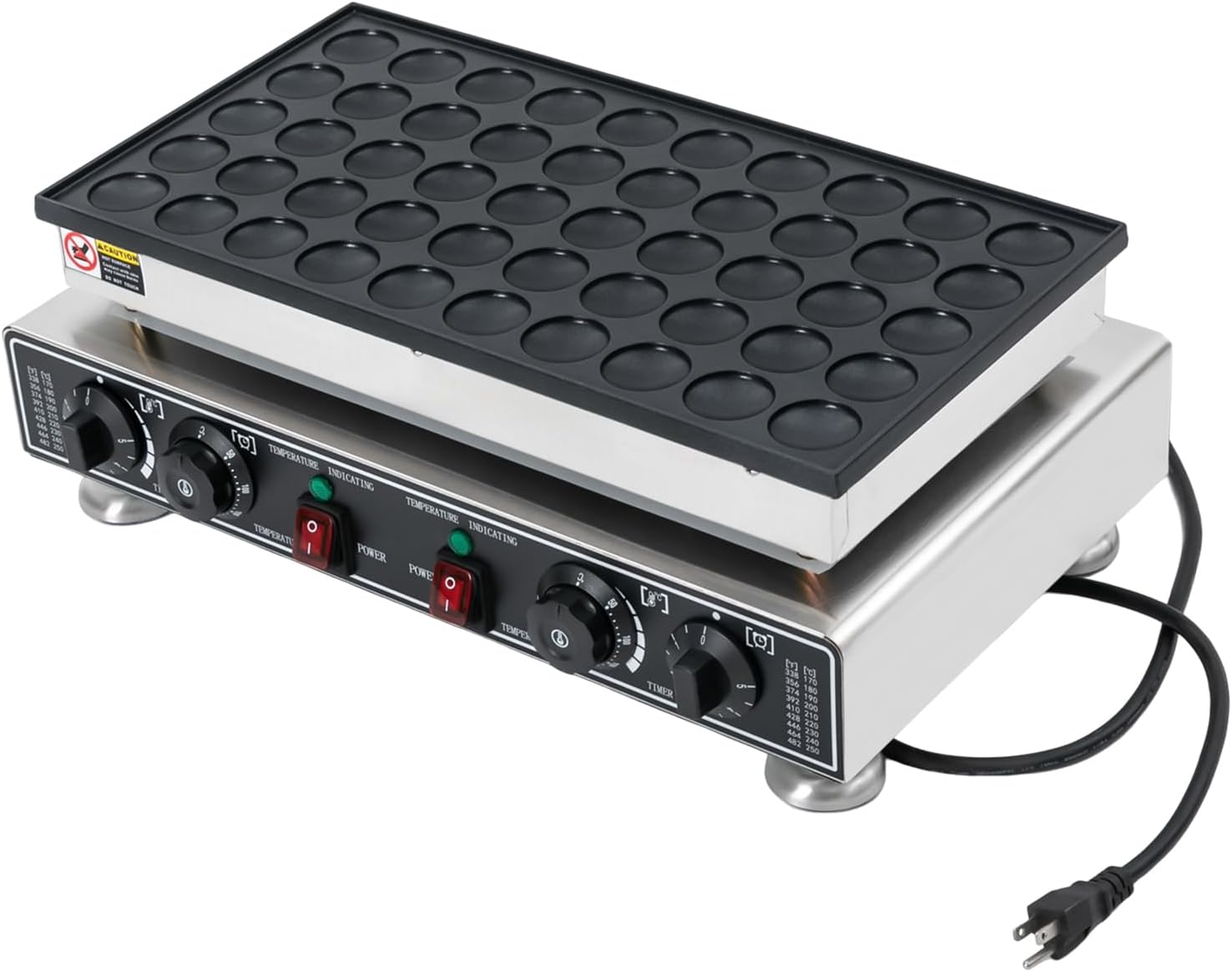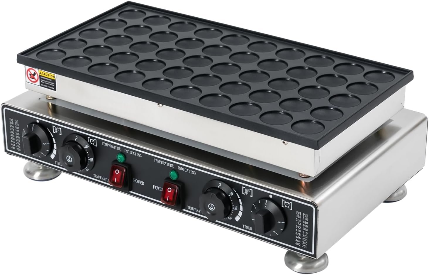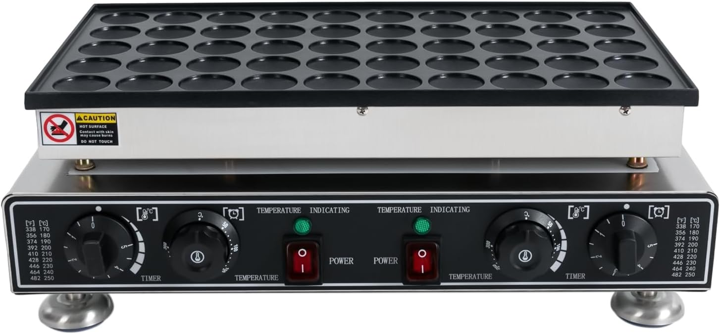 • 【Adjustable and Intelligent】Commercial mini pancake making machine timer (1-5min) and temperature adjustment knob (122-572℉) can meet a wide range of production needs. Two separate control zones bring flexibility for muffin making and commercial use.