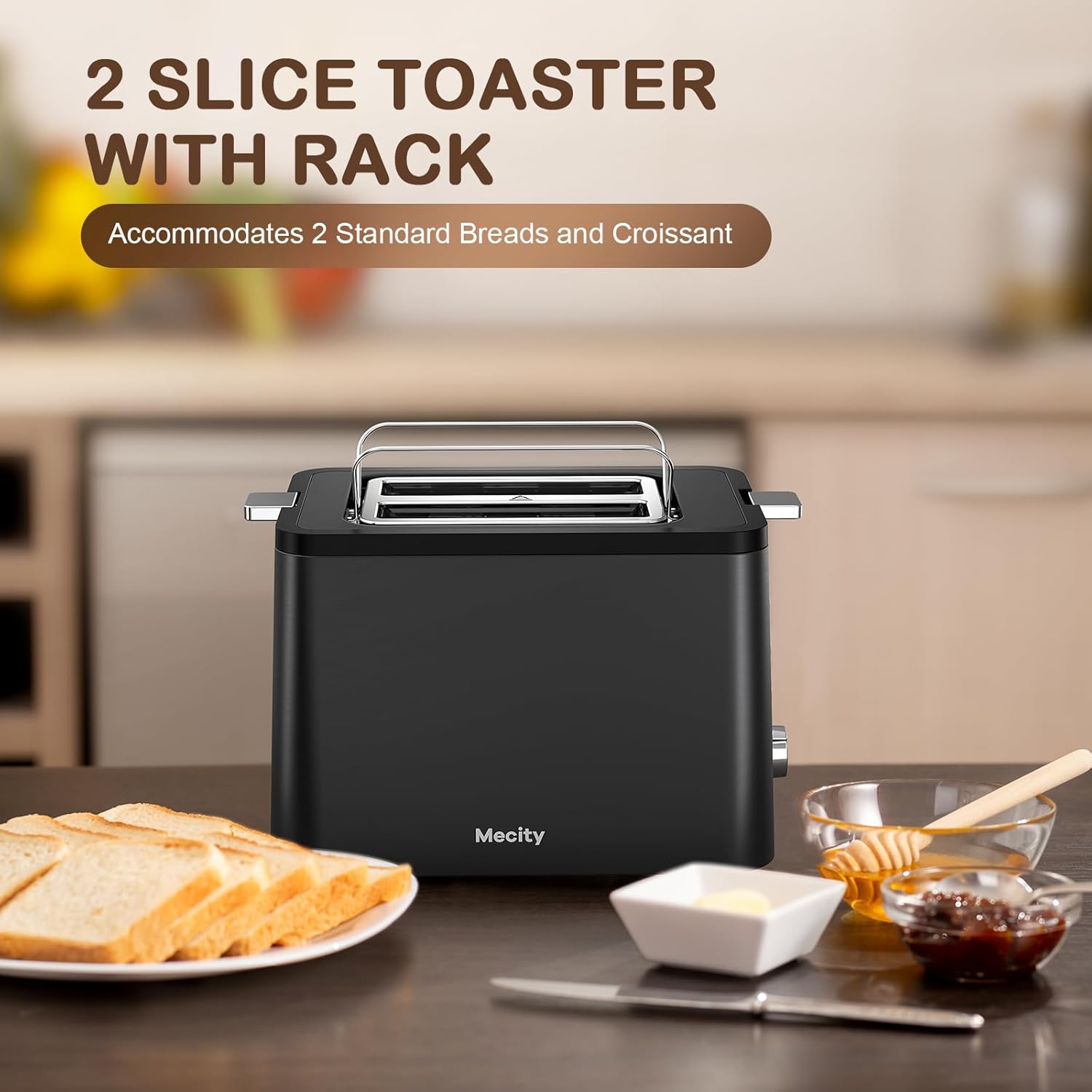 Mecity Toaster 2 Slice Stainless Steel Body, Timer, Bagel, Defrost, Reheat, Cancel Functions, Warming Rack, Removable Tray, 6 Browning Settings, Extra Wide Slots, Bread Toaster, 120V 800W Black