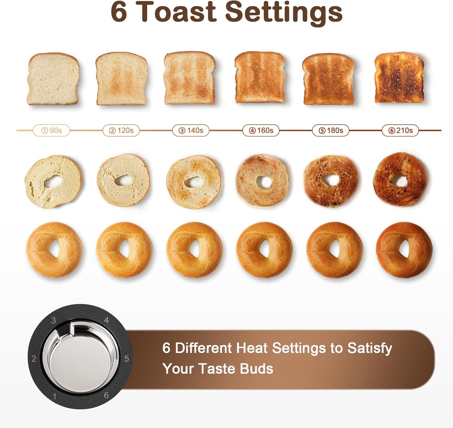 • 【More Heating Modes】: There are more modes to meet your daily needs, REHEAT mode will heat your toasts for 30 seconds to warm them up, BAGEL mode will heat up one side and keep the other side warm, in DEFROST mode you could easily defrost and toast the breads at one go