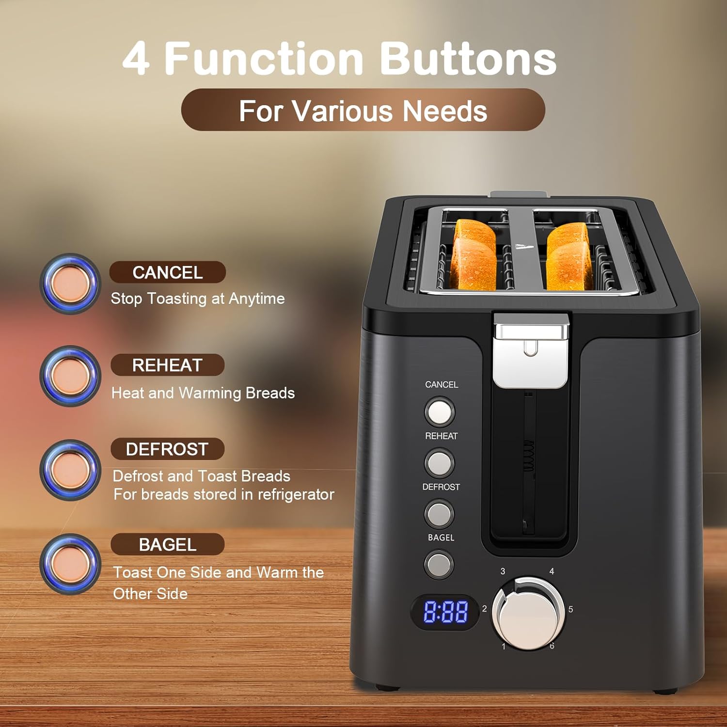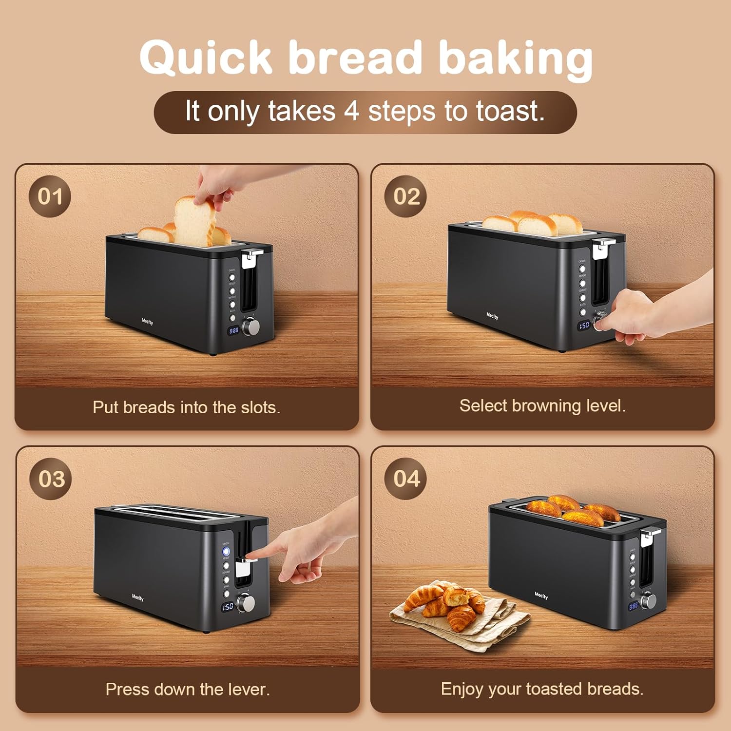 • 【Digital Countdown Timer】: After the lever pressed down, the digital countdown timer will dispaly the browning level you chose for 4 seconds, then a countdown timer will tell you how much time needed to complete the toasting, helps you to keep other kitchen works orgnized. The breads will pop up at a position where you can easily get breads out without burning fingers