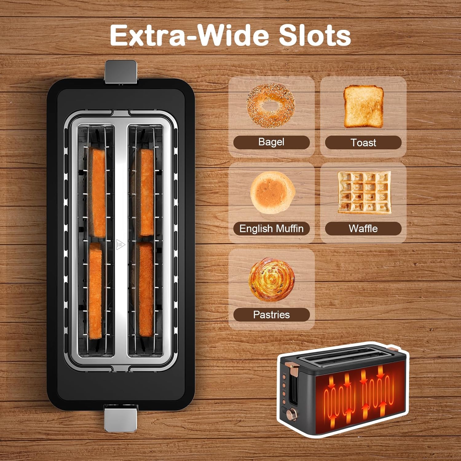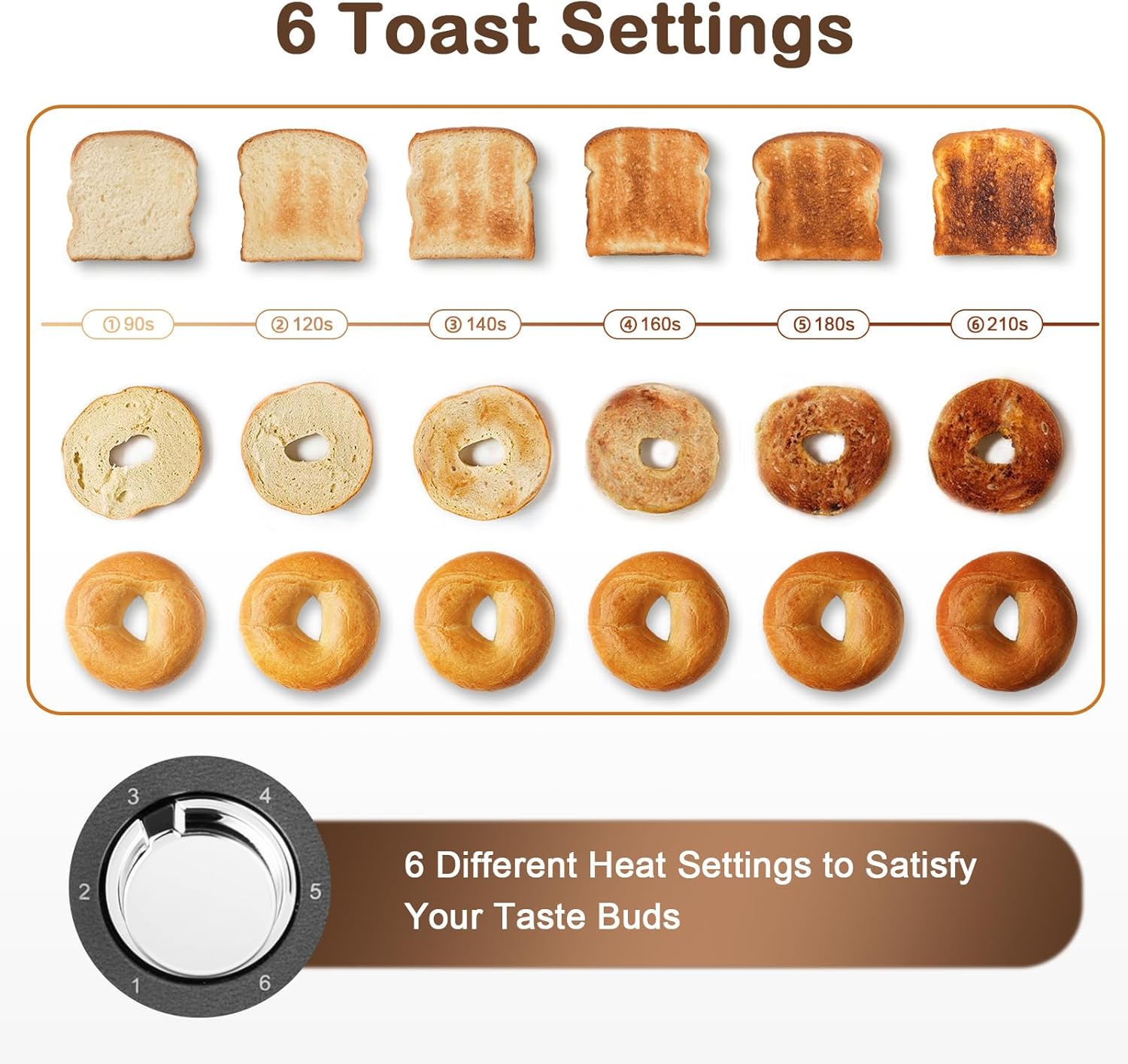 • 【More Heating Modes】: There are more modes to meet your daily needs, REHEAT mode will heat your toasts for 30 seconds to warm them up, BAGEL mode will heat up one side and keep the other side warm, in DEFROST mode you could easily defrost and toast the breads at one go