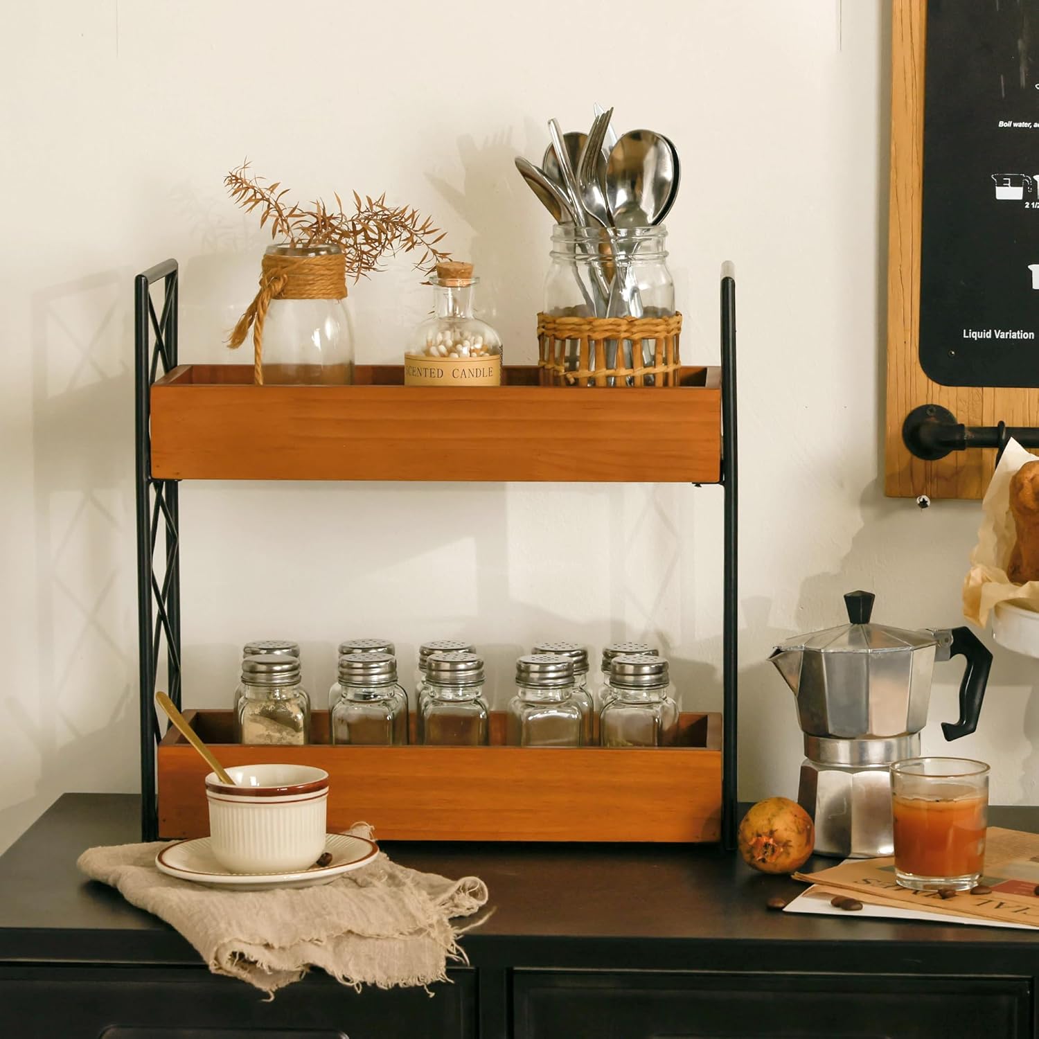 • 【Stable & Safe Design】Durable wooden shelves with metal cross-support brackets ensure stability and long-lasting performance. The open-shelf design allows for quick visibility and access to all your jars, streamlining your cooking process