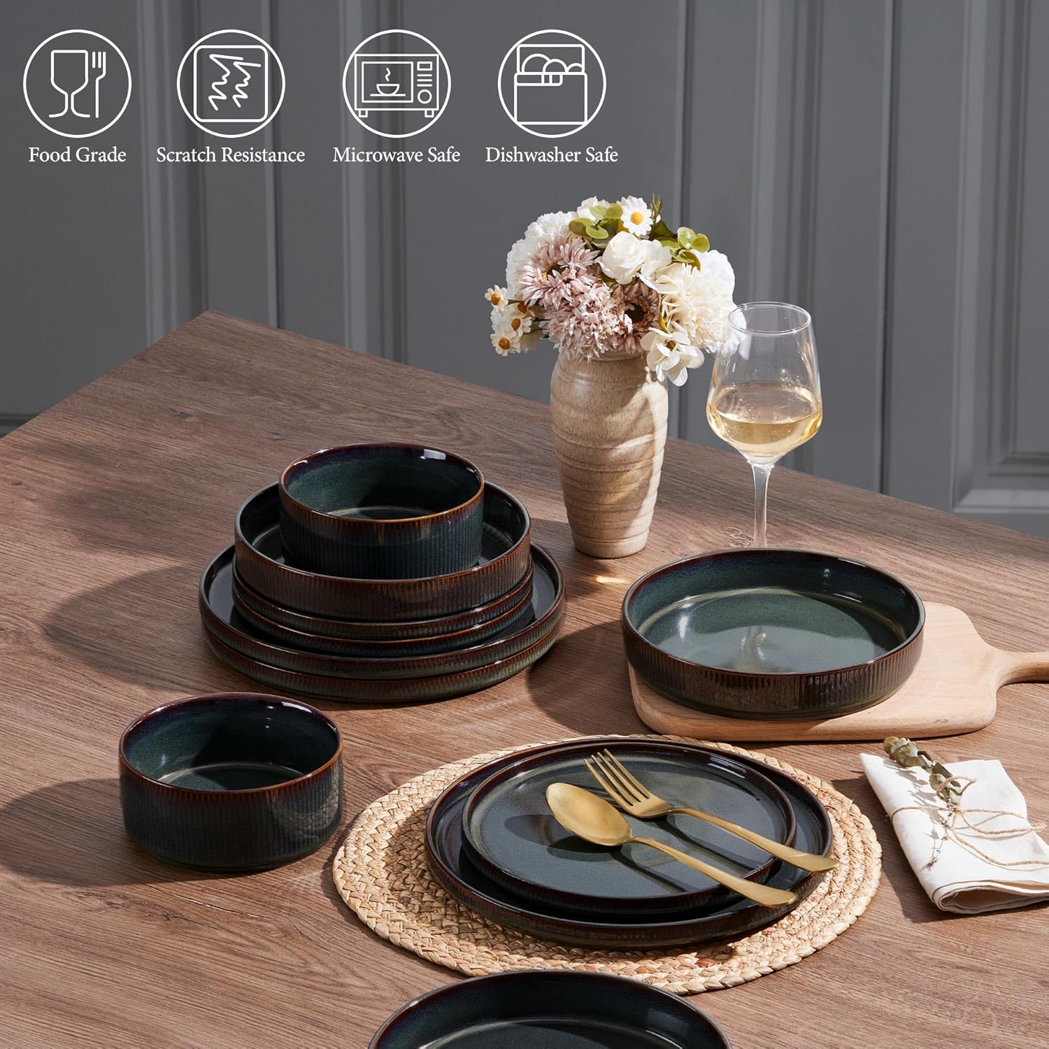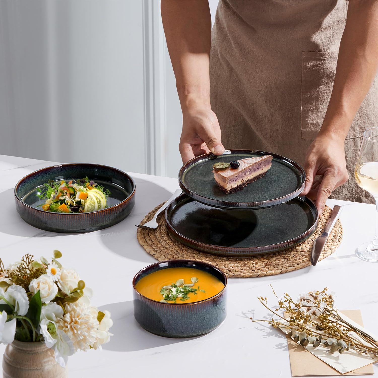 • HEALTHY & DURABLE STONEWARE: Our dinnerware set is made of natural clay and food grade glaze, Fired at a temperature above 2340°F, lead-free, cadmium-free, heavy metal-free, and strong construction ensures durability, Enjoy your meal without worrying about harmful substances