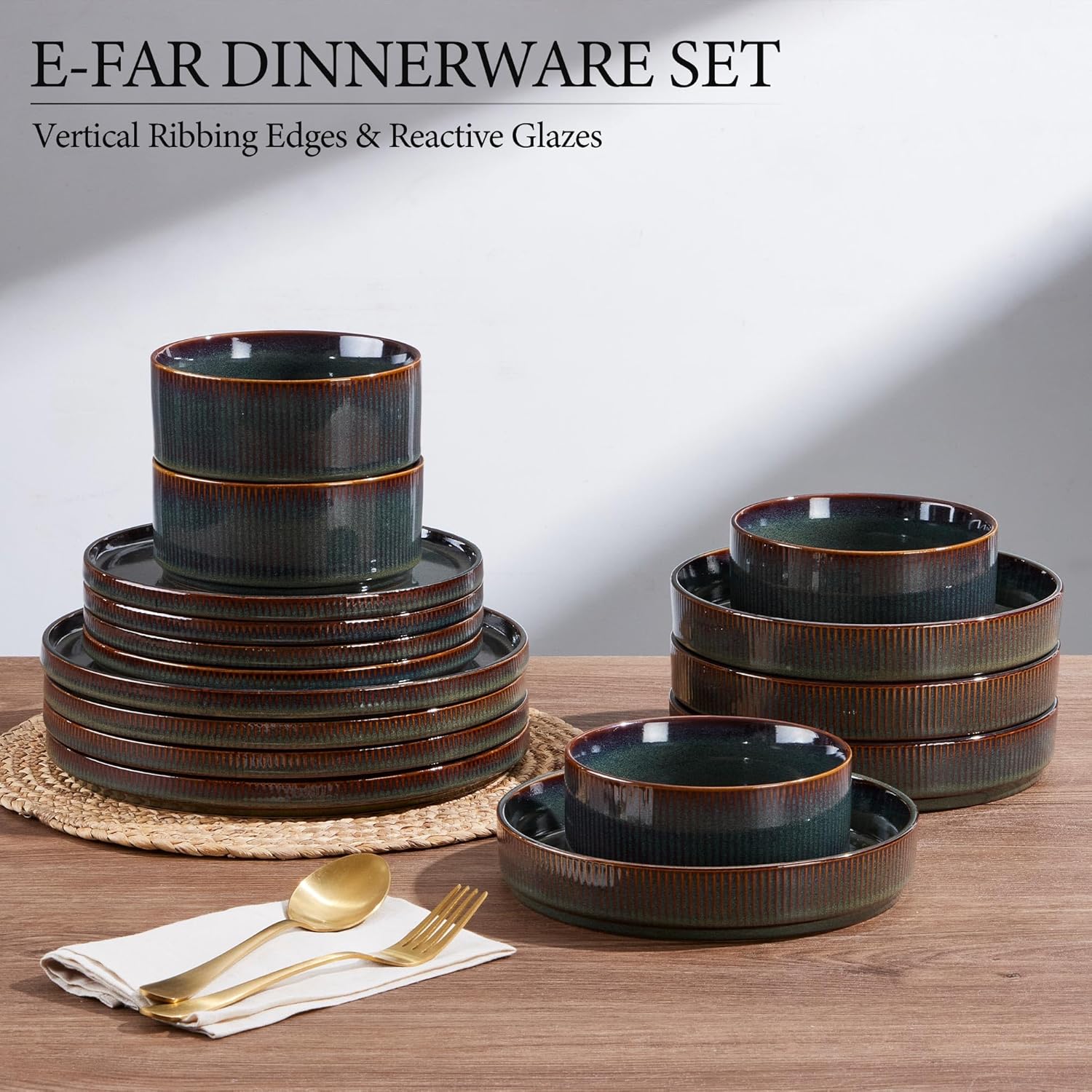 E-far 16 Piece Dinnerware Sets, Plates and Bowls with Pasta Bowls Service for 4, Modern Stoneware Ribbed Dishes for Kitchen Dining, Microwave & Dishwasher Safe, Blackish Green