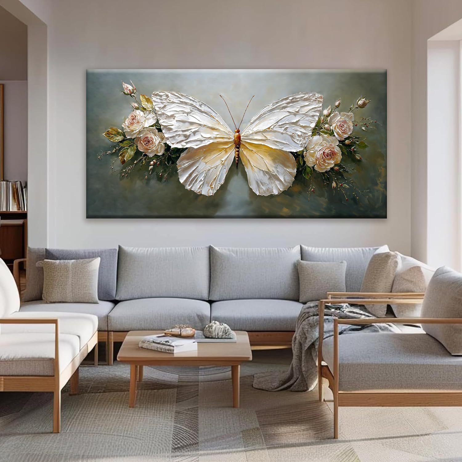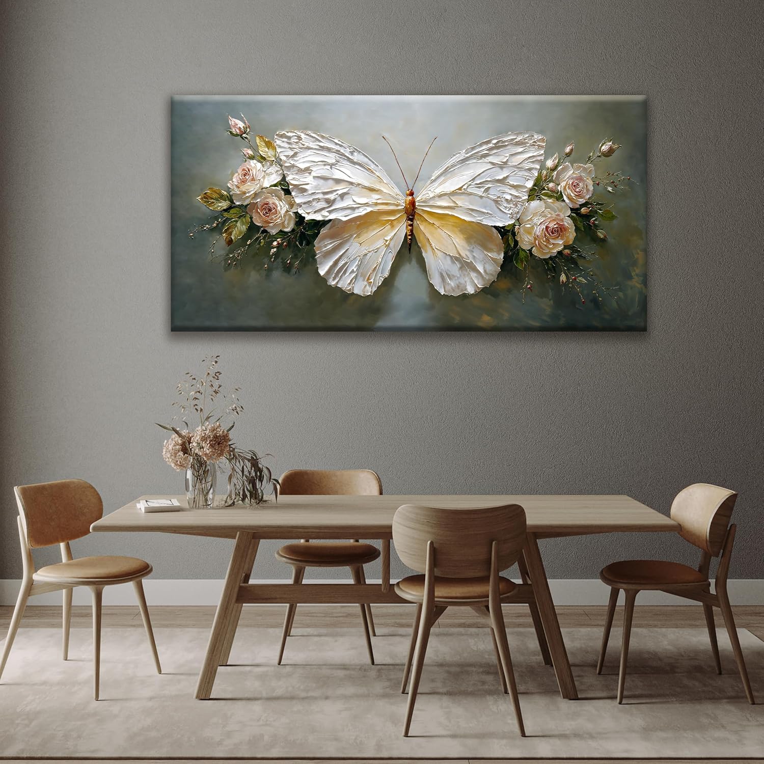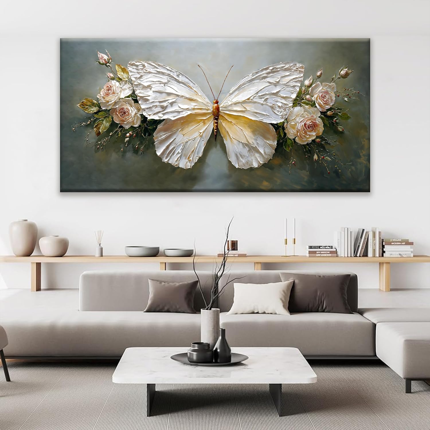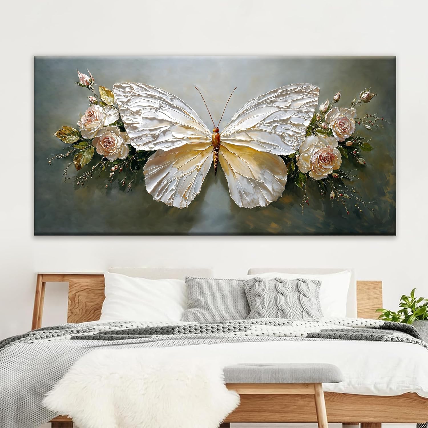 Large Wall Art Decor Abstract White Simple Butterfly And Rose Wall Art For Living Room Bedroom Office Kitchen Home Wall Decor 29x58 Inch Modern Abstract Artwork