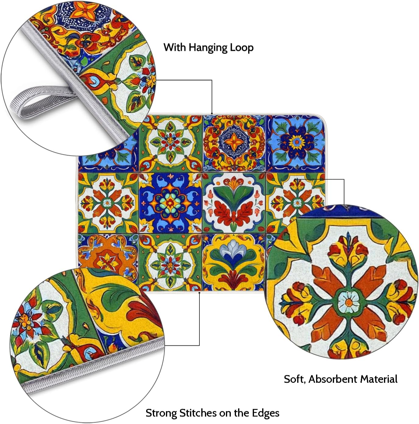 Dish Drying Mats for Kitchen - Super Absorbent Dish Dryer Mat for Countertops Microfiber Dishes Drainer Pad Hide Stain Draining Rack Mat Gadgets for Easy Clean Multi-Use 16"x18" (Mexican Tiles, S)