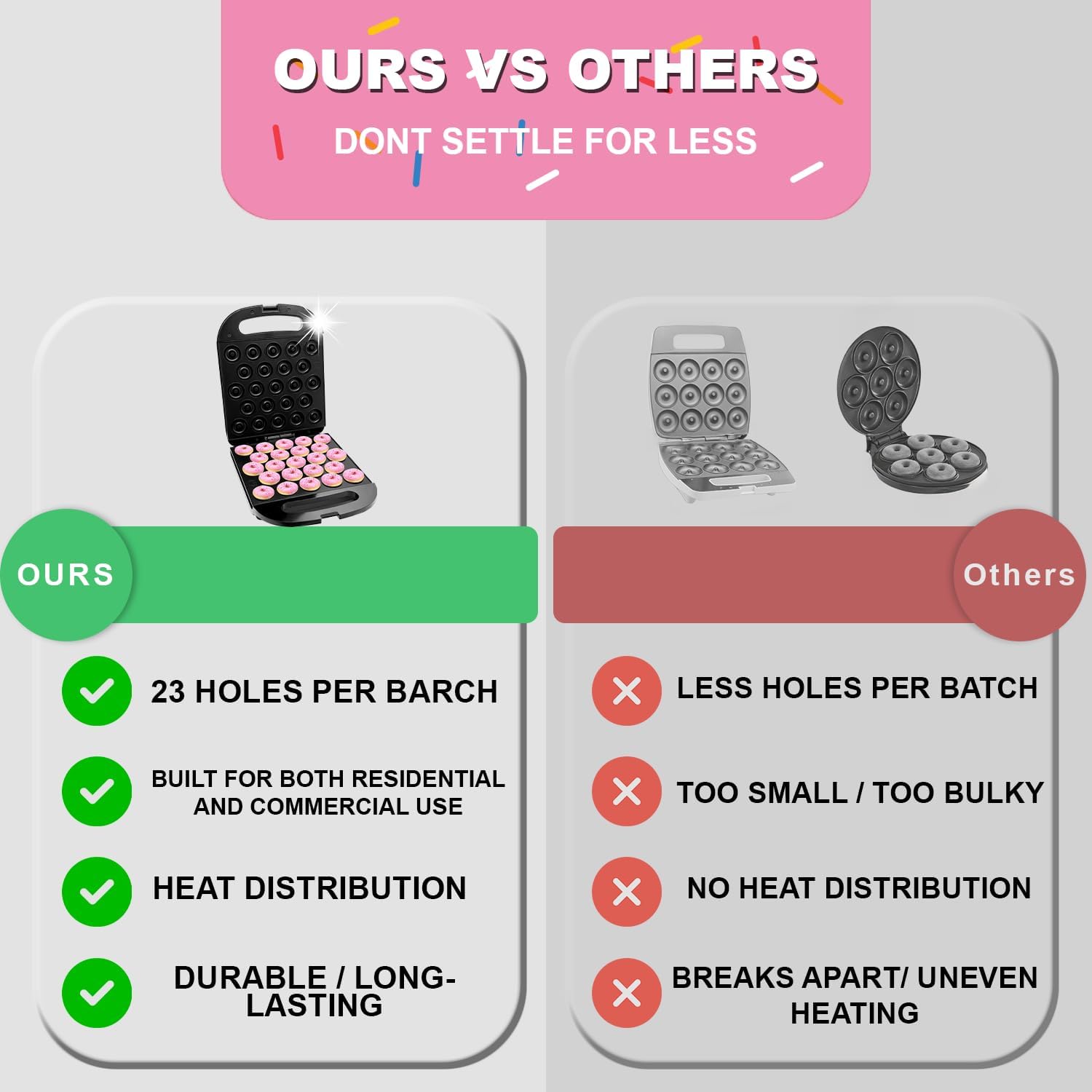 • Make 23 Mini Donuts at Once: Save time and bake more! Our electric mini donut maker cooks up to 23 perfectly shaped mini doughnuts in just minutes — ideal for breakfast, snacks, or parties.