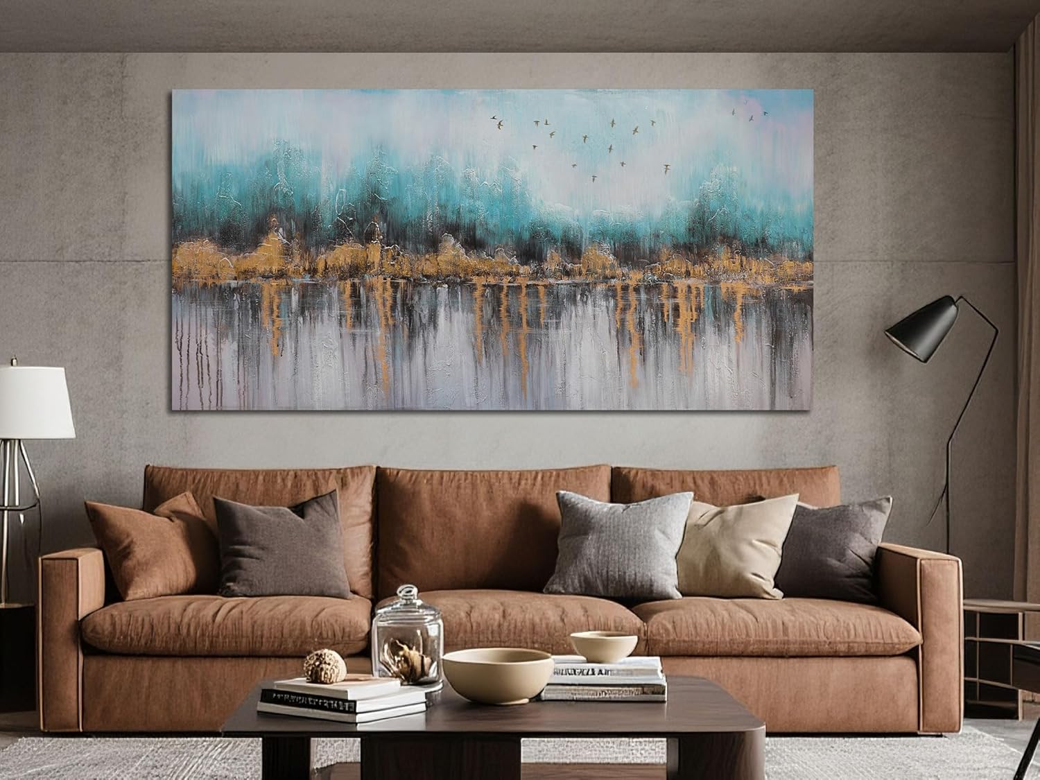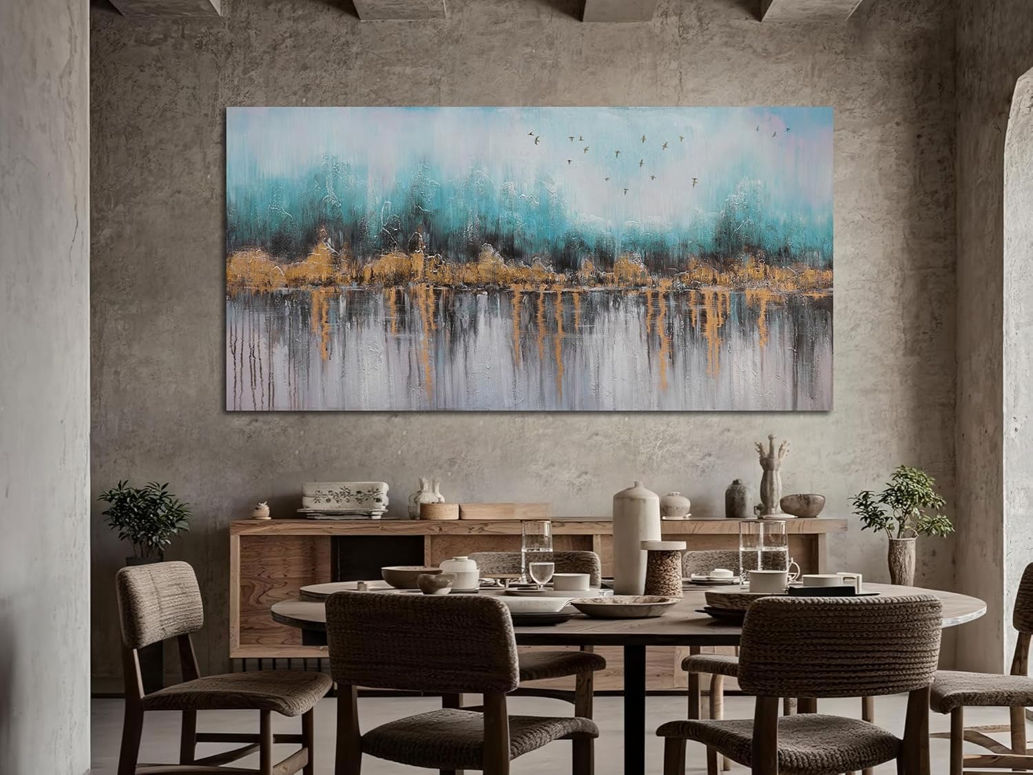 • Abstract Wall Art Size: 58inx29in (147cmx74cm), framed gallery wrapped ready to hang. It do have hand-painted textured, blue and teal colors create a unique and eye-catching piece that will be sure to draw attention