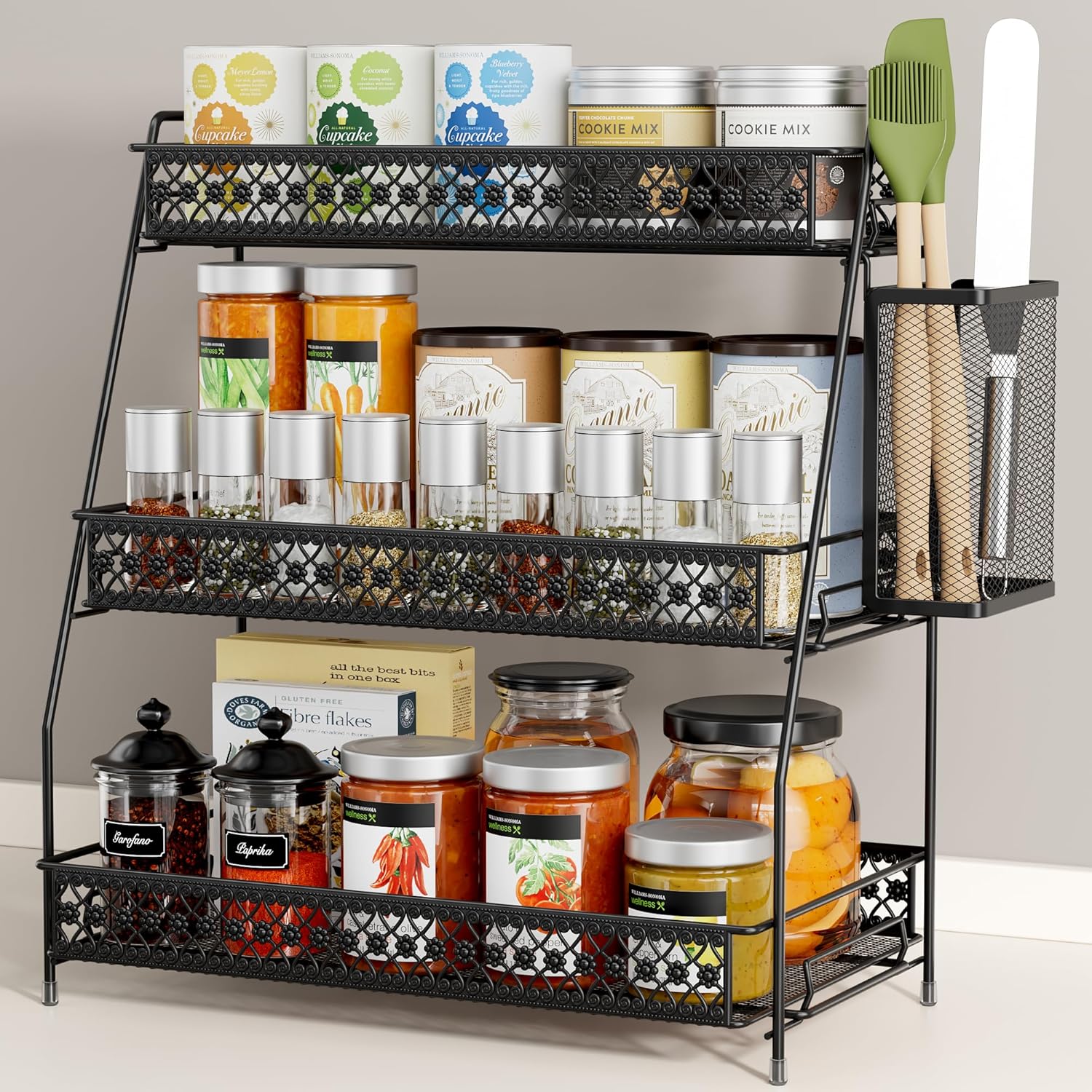 Vintage 3 Tier Spice Rack Organizer for Kitchen Counter, Bathroom Counter Organizer with Bonus Basket, 3 Tier Bathroom Counter Organizer for Spices Makeup Perfumes, Retro Countertop Organizer