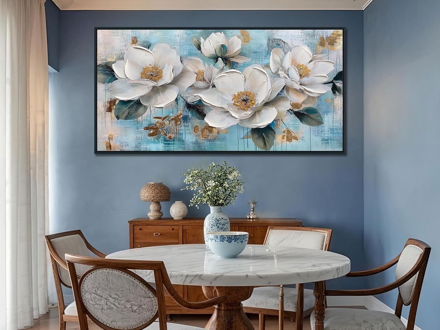 Ardemy White Floral Wall Art, Framed Canvas Wall Art For Living Room Large Teal Pictures Wall Decor Flower Paintings Artwork for Walls Dining Room Bedroom Home Office 40"x20"